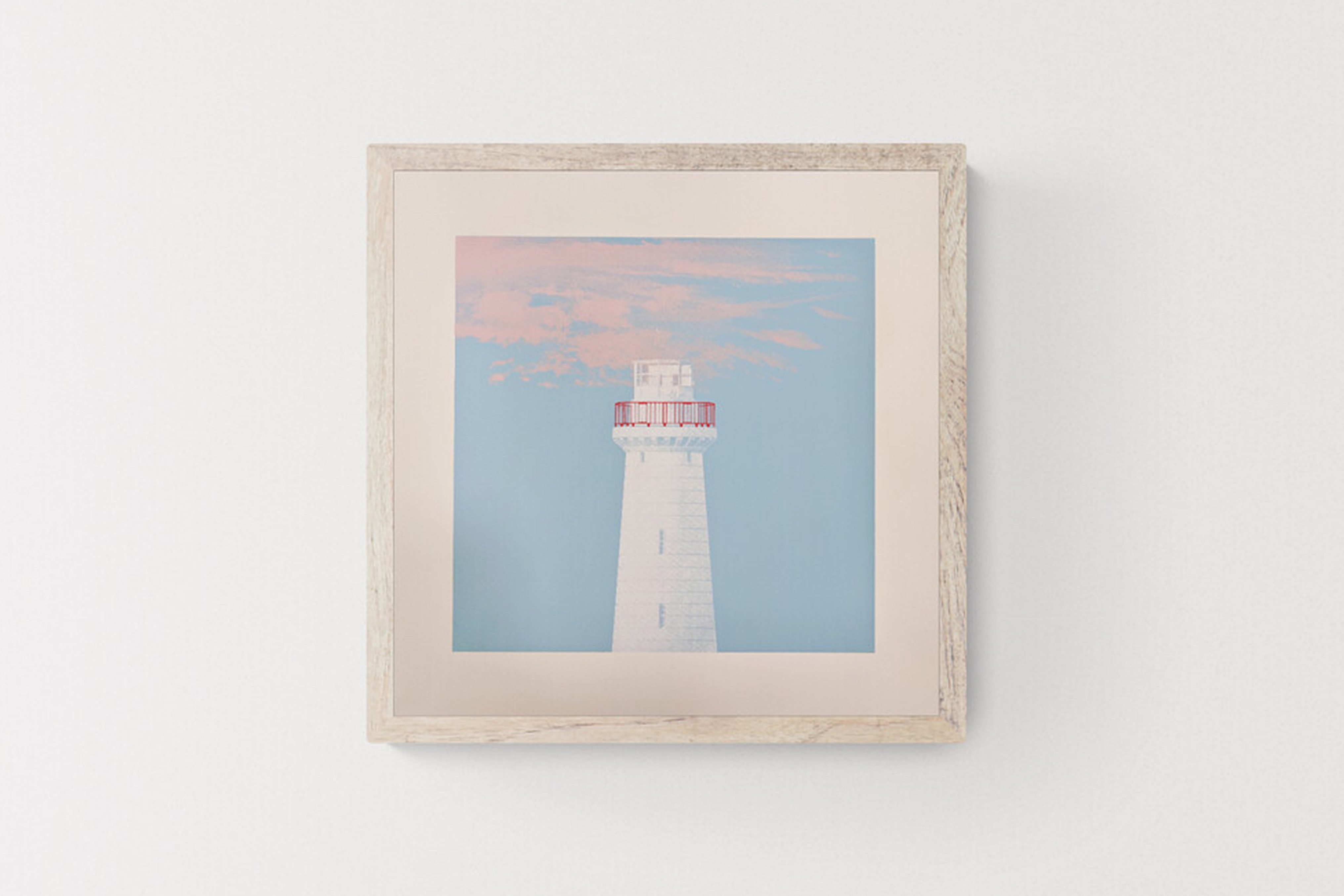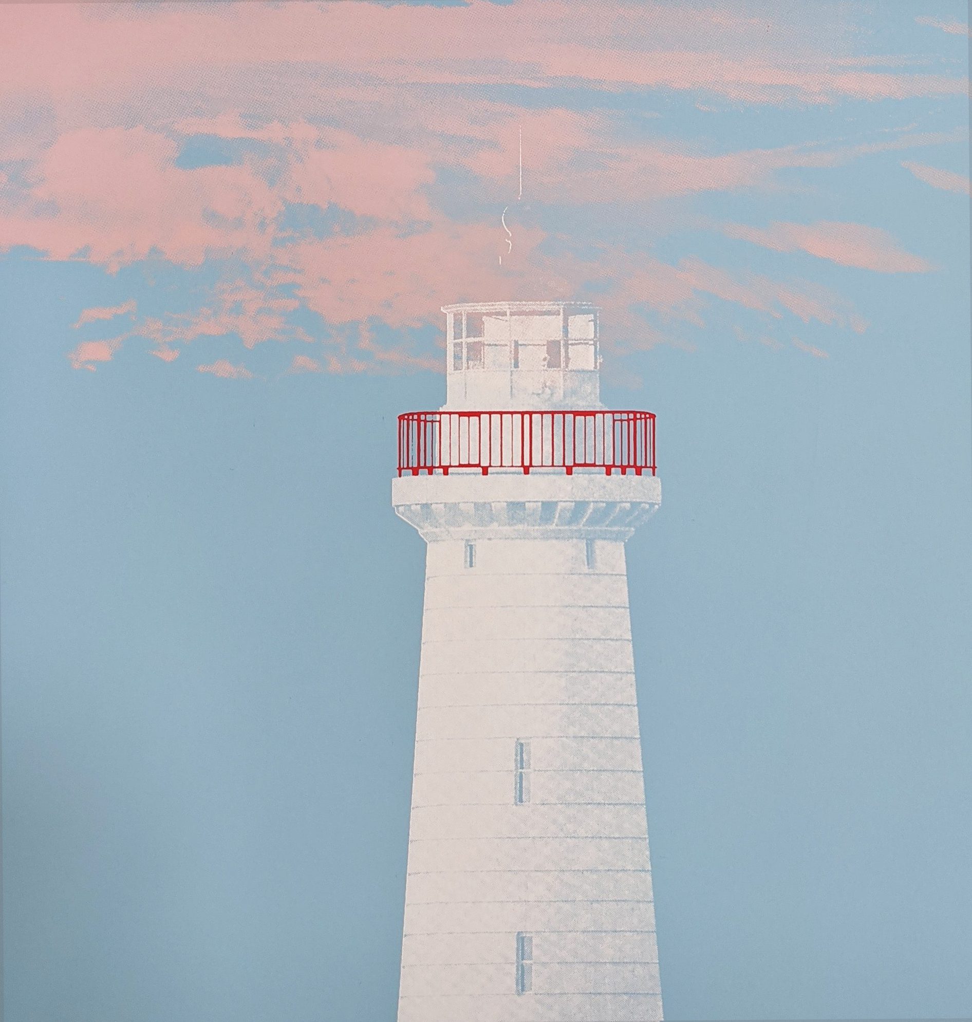 4 layer pink, blue, white and red, lighthouse collage screen print.