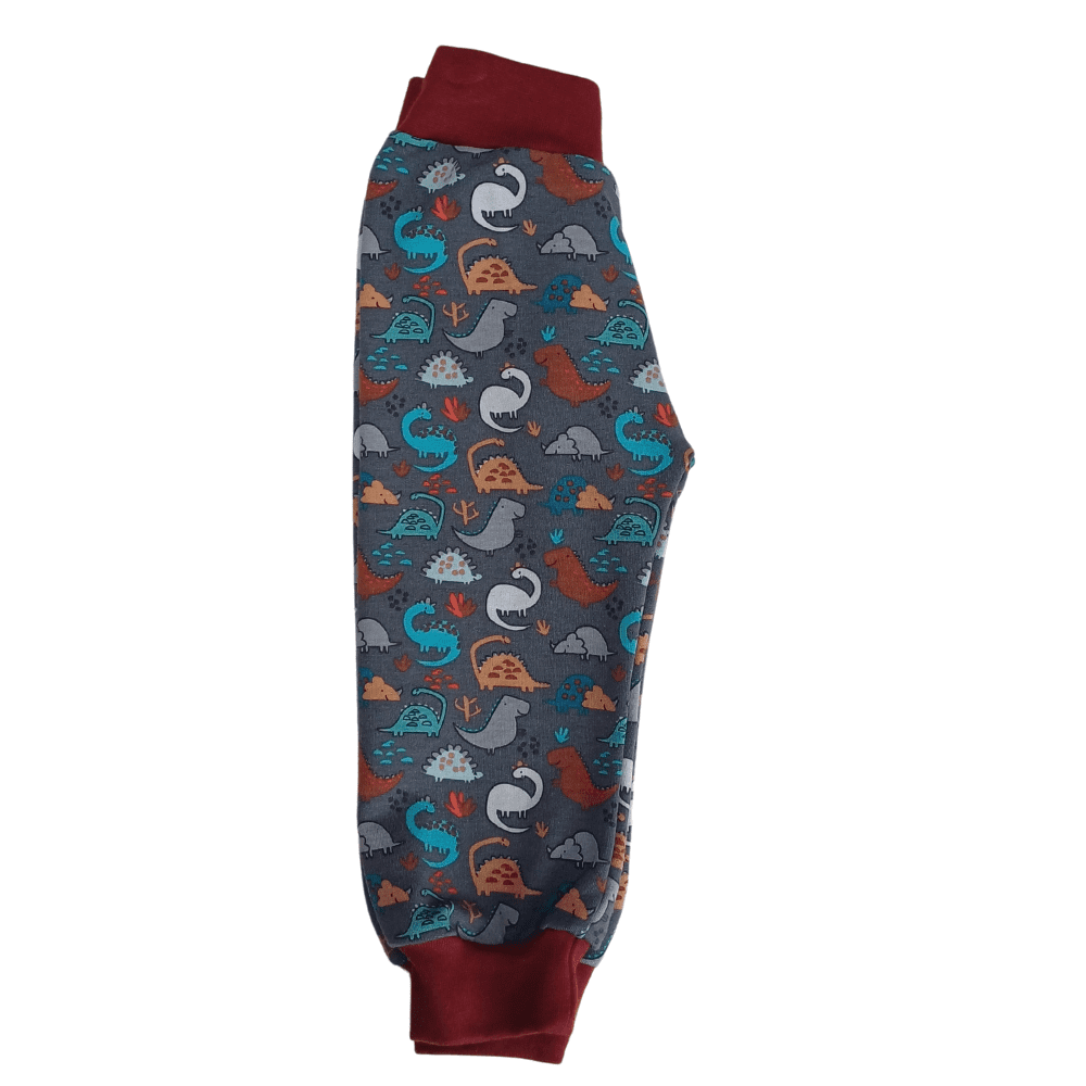 A lovely warm pair of joggers in cute dinosaur print on a grey background with contrast waistband and ankles.