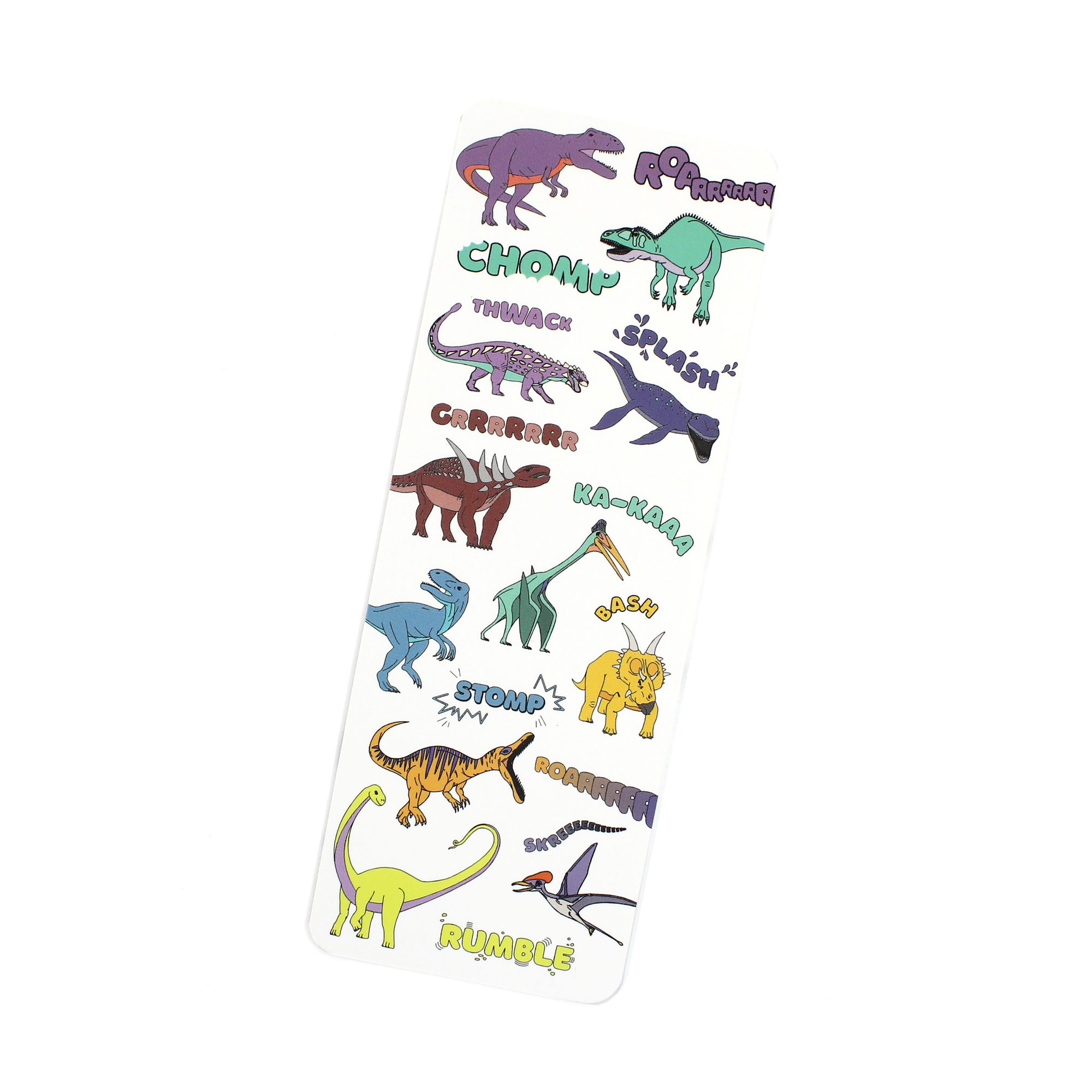Featuring 11 colourful dinosaurs with words that describe a sound or action (eg. chomp, splash, ka-kaaaa and of course, roar). The design is on a white background.