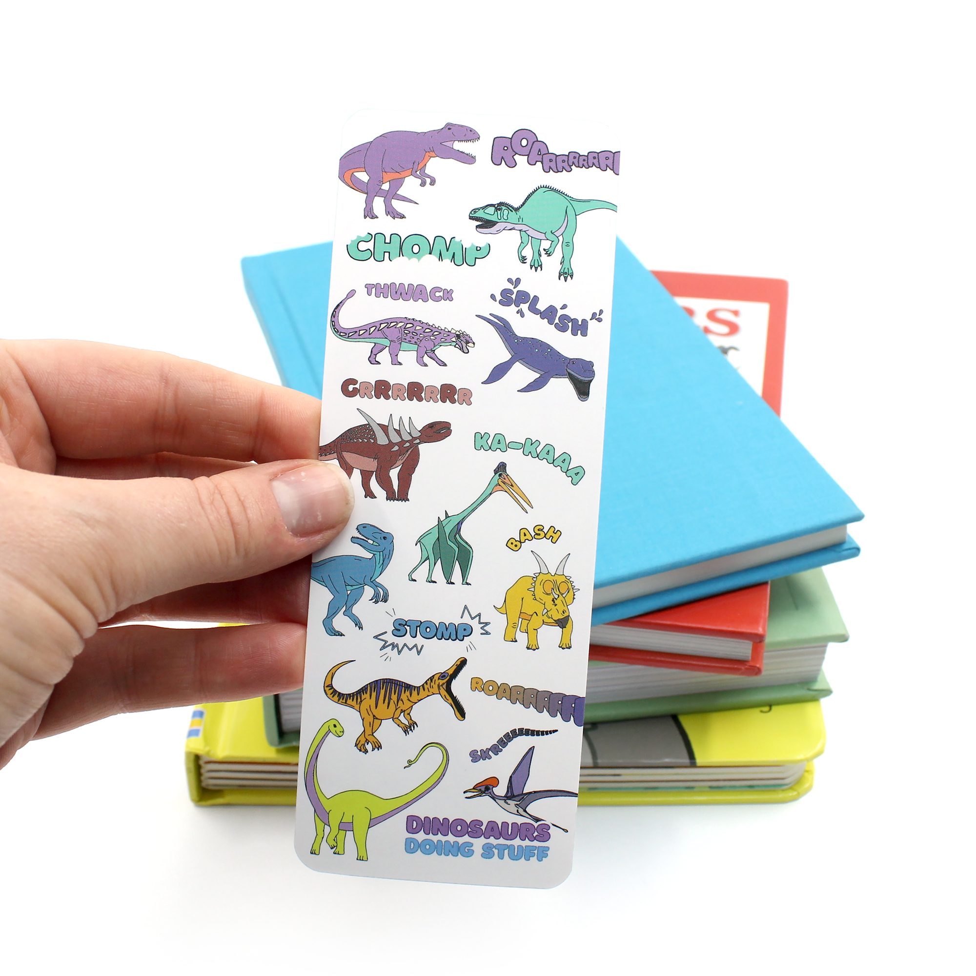 The design is the same on the front and back. Each bookmark features my ‘Dinosaurs Doing Stuff’ logo at the bottom on one side (this hides some of the design).