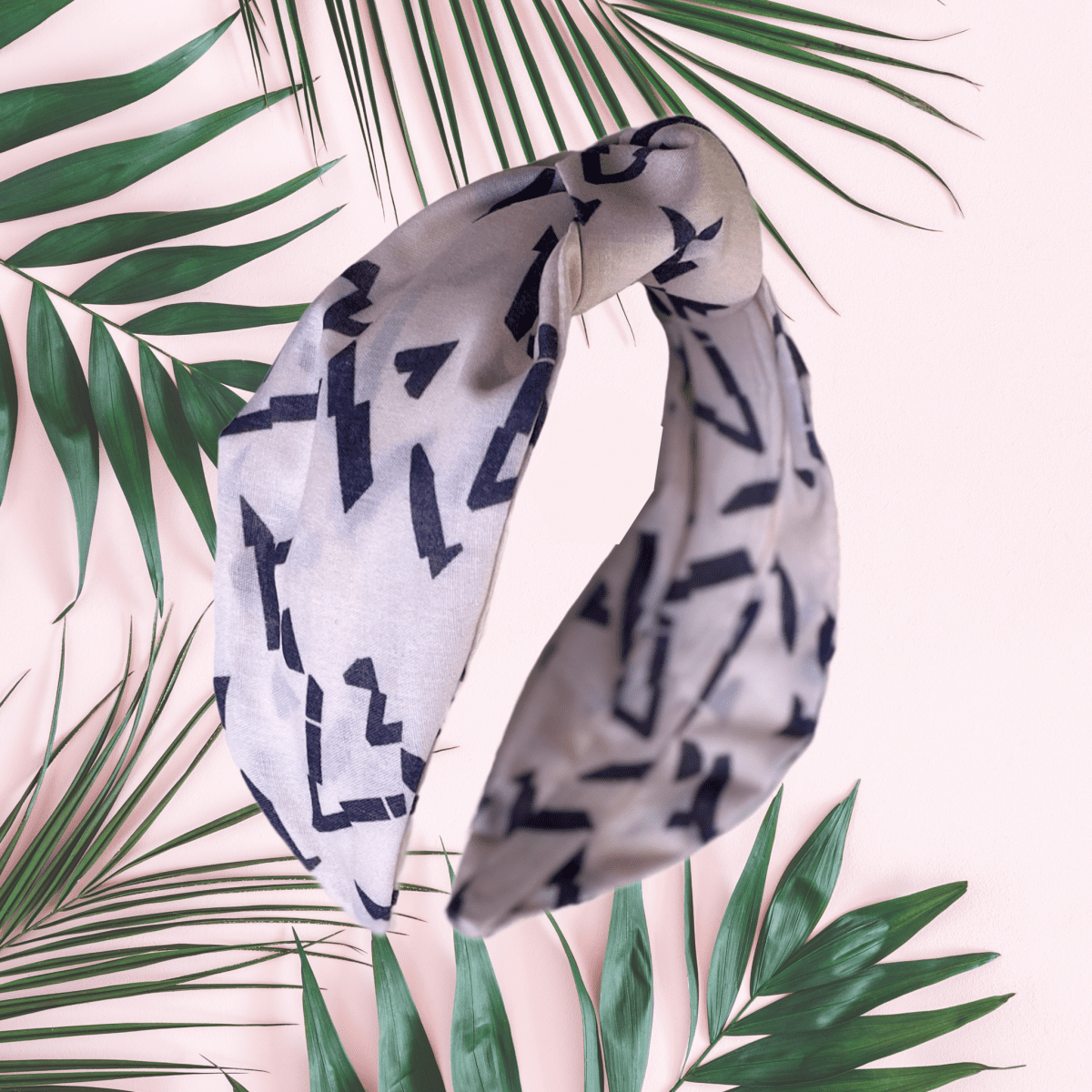 Light cotton knotted headband with blush & grey design – in ‘Direction’