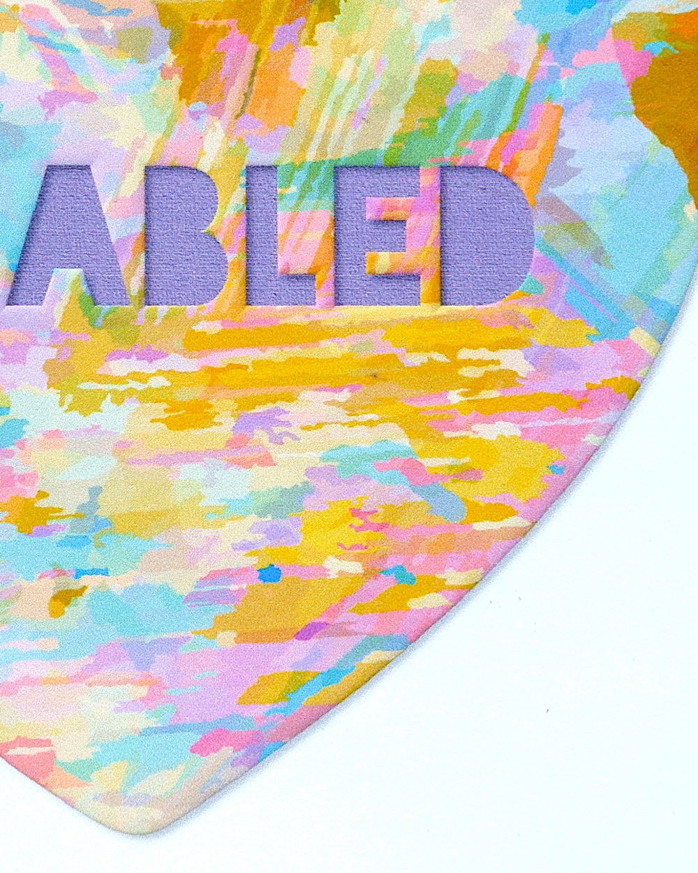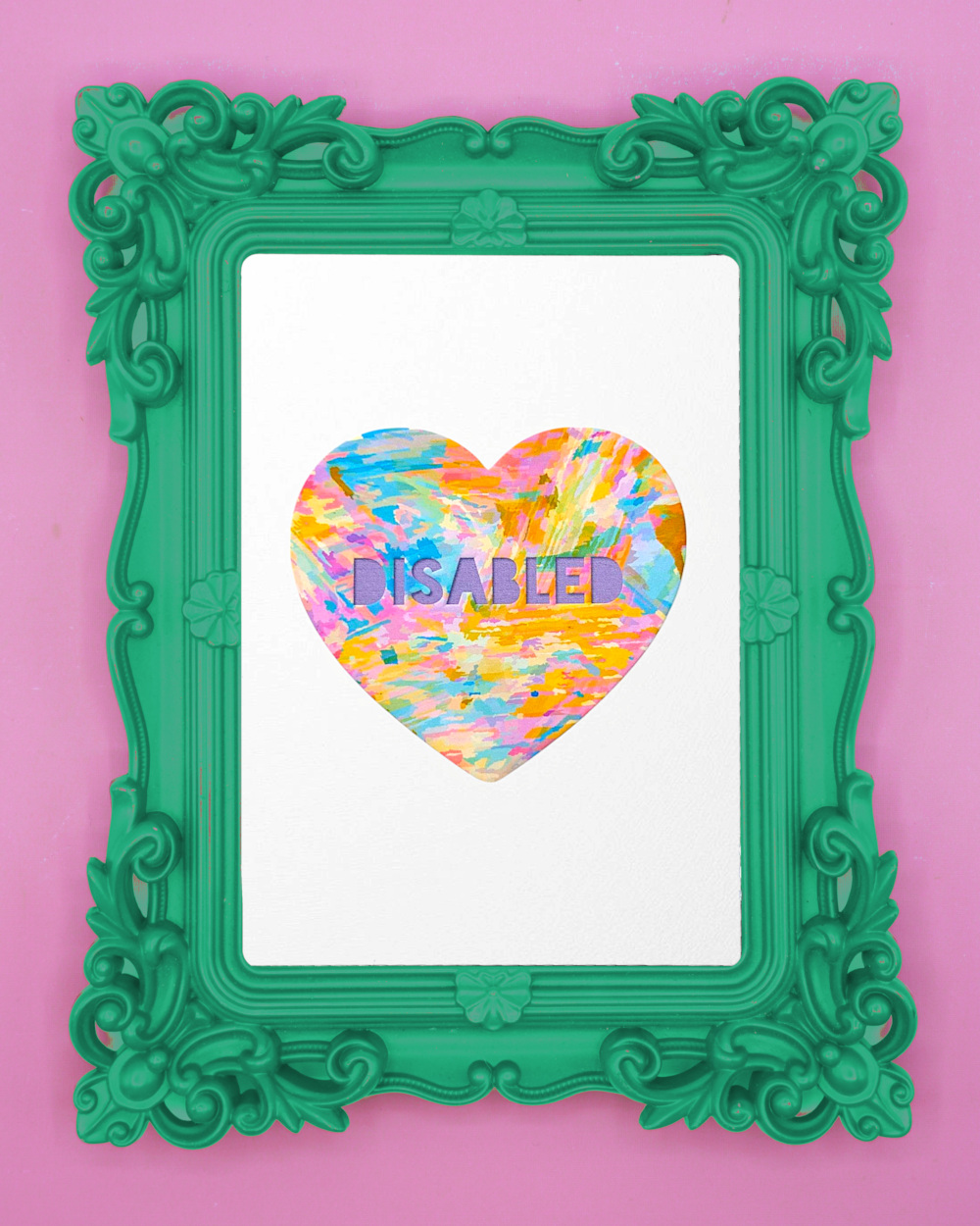 I love that ‘Disabled’ is no longer a dirty word, especially having lived with chronic illness since childhood. With that in mind, I wanted to use my colourful art to show that ‘disabled’ is not a synonym for boring or sterile. We are all joyous, colourful people who deserve to be seen!