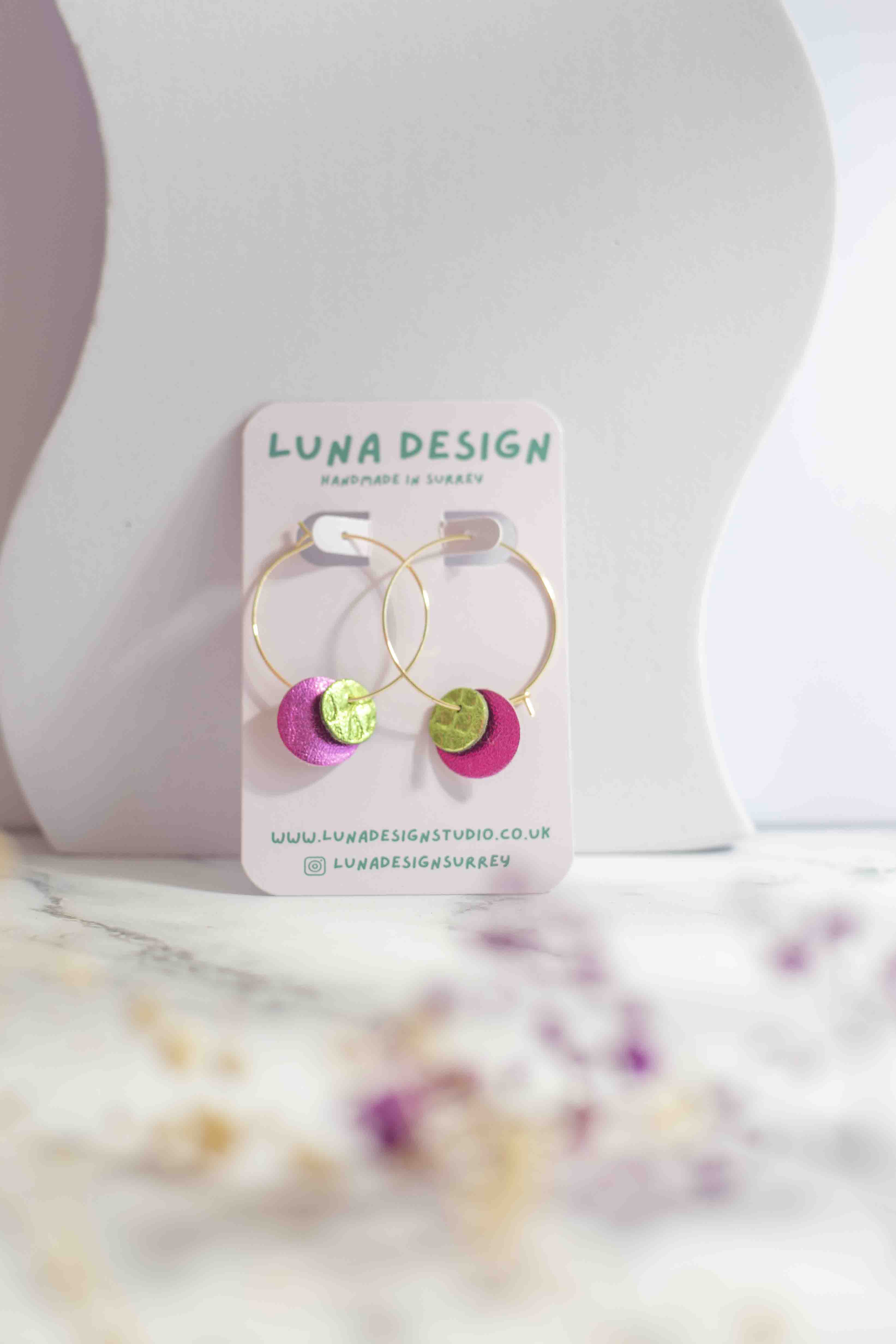 Add vibrant colour and bold style to your look with these pink and green leather circle earrings, handmade in Surrey, UK. Featuring soft, high-quality leather in contrasting shades and finished with elegant 30mm gold-plated hoops, these statement earrings are eye-catching yet incredibly lightweight – perfect for all-day wear.
