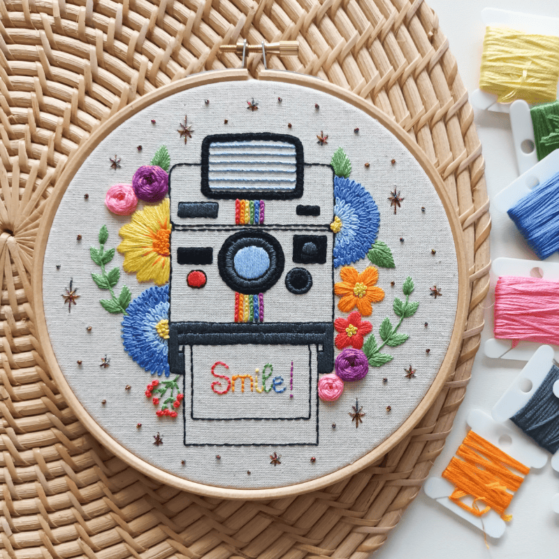 This listing is for a complete physical embroidery kit. When photography meets embroidery, this design is the result: full of bright colours and floral accents, with a Polaroid camera as a protagonist, it is a true celebration of the power of smiling and positivity.