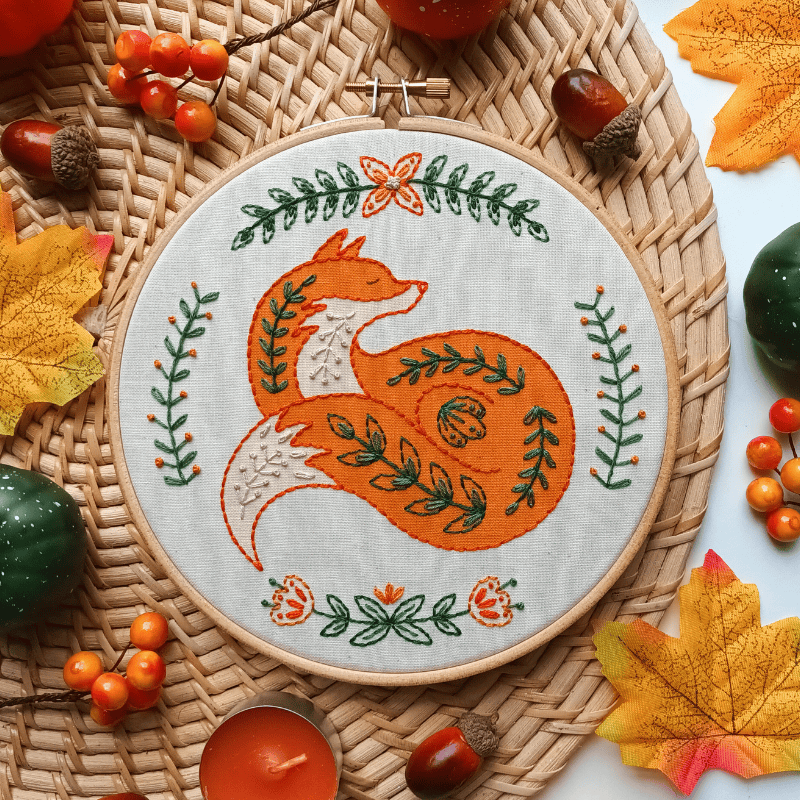This listing is for a complete physical embroidery kit. A simple autumnal design inspired by folk art, with warm oranges and greens shades, this fox pattern has a cosy and snug vibe.