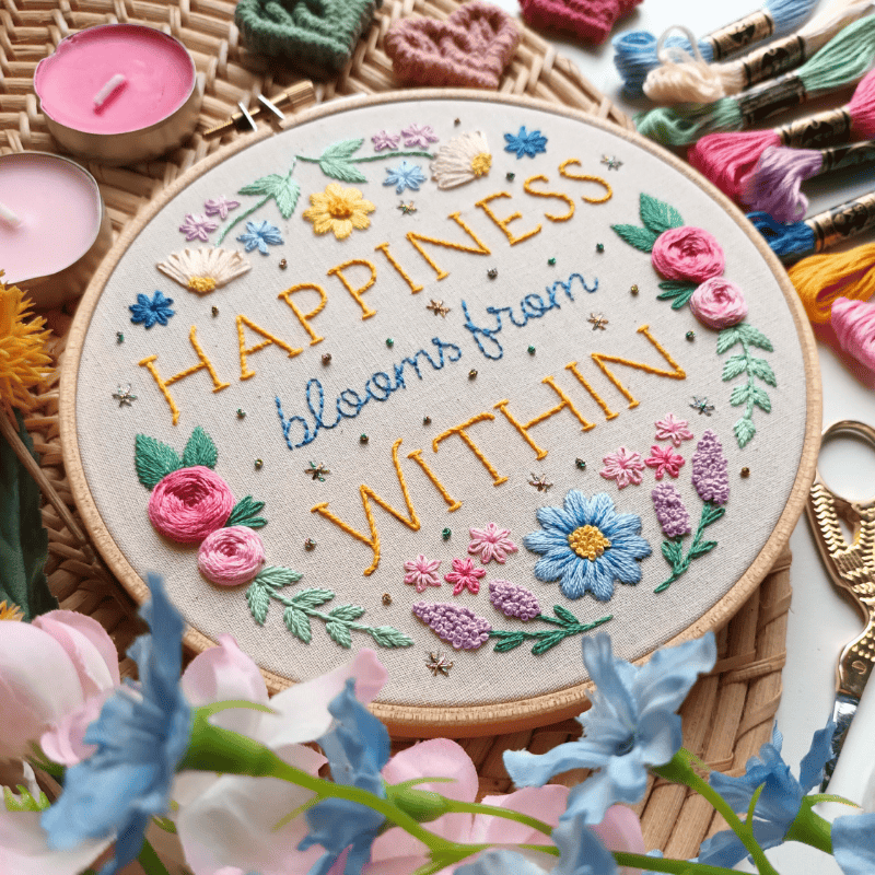 This listing is for a complete physical embroidery kit. A truly mindful project, from start to finish: vibrant colours, a good variety of embroidery techniques and textures, and beautiful decor piece as a result with a powerful quote.