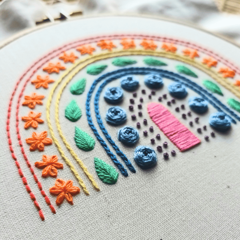 This rainbow pattern is designed to be a stitch sampler so that each element focuses on one specific colour and embroidery technique, making this perfect as a first embroidery project.