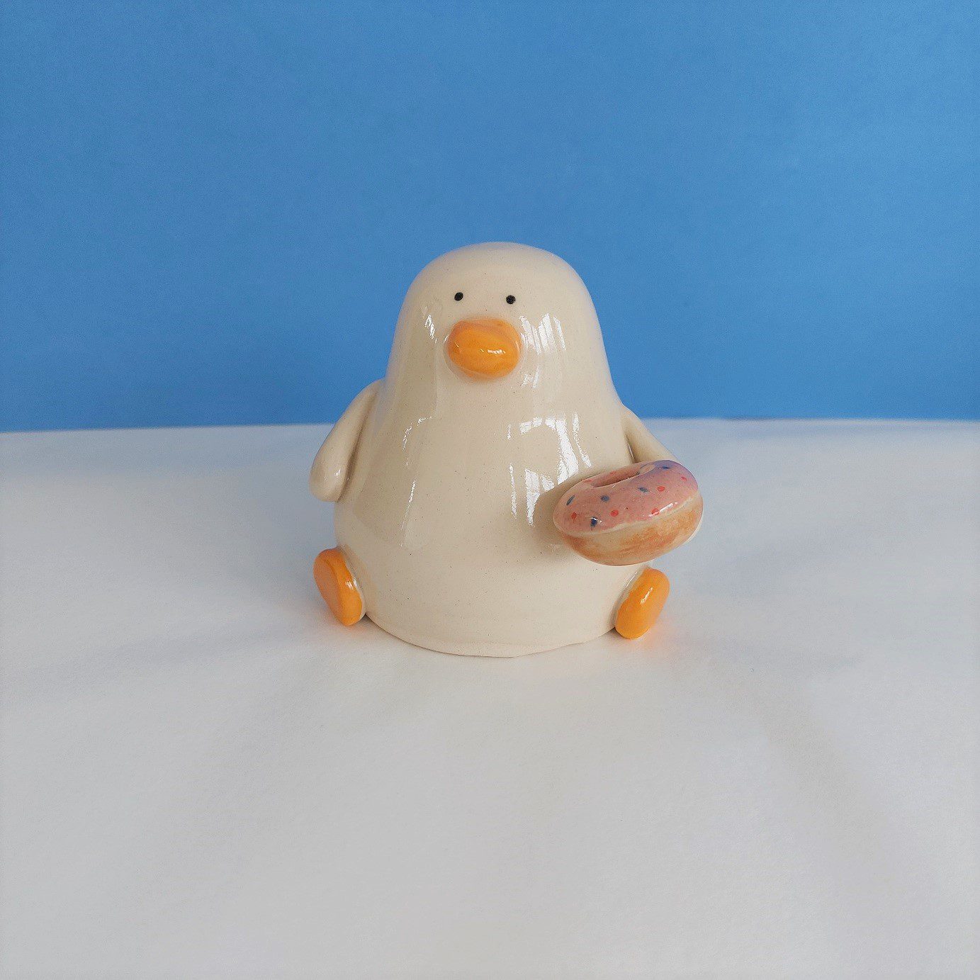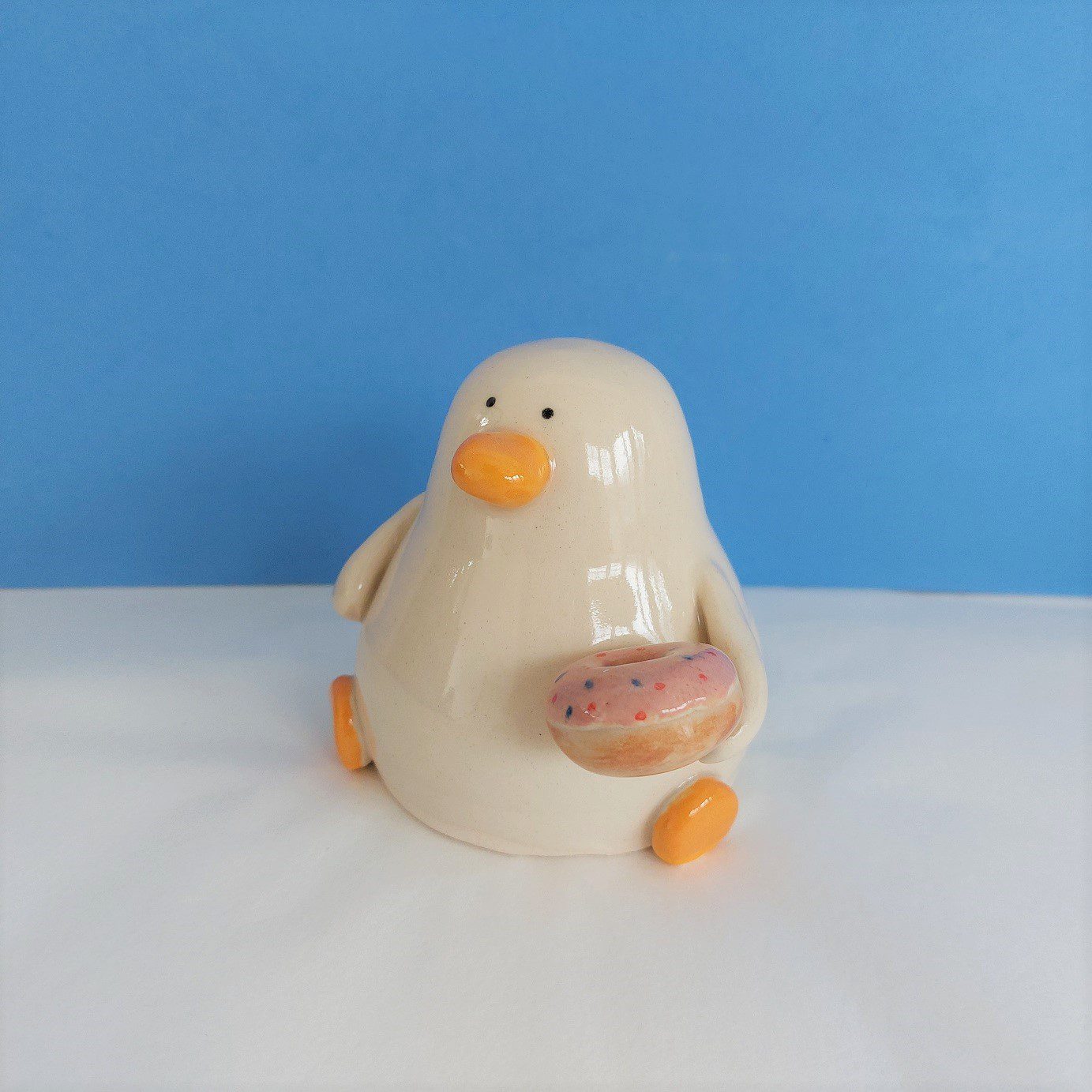Duncan is 100% handmade from start to finish. Wheel-thrown white stoneware clay, added ducky features and doughnut, underglazed, biscuit fired and transparent glazed then glost fired to stoneware.