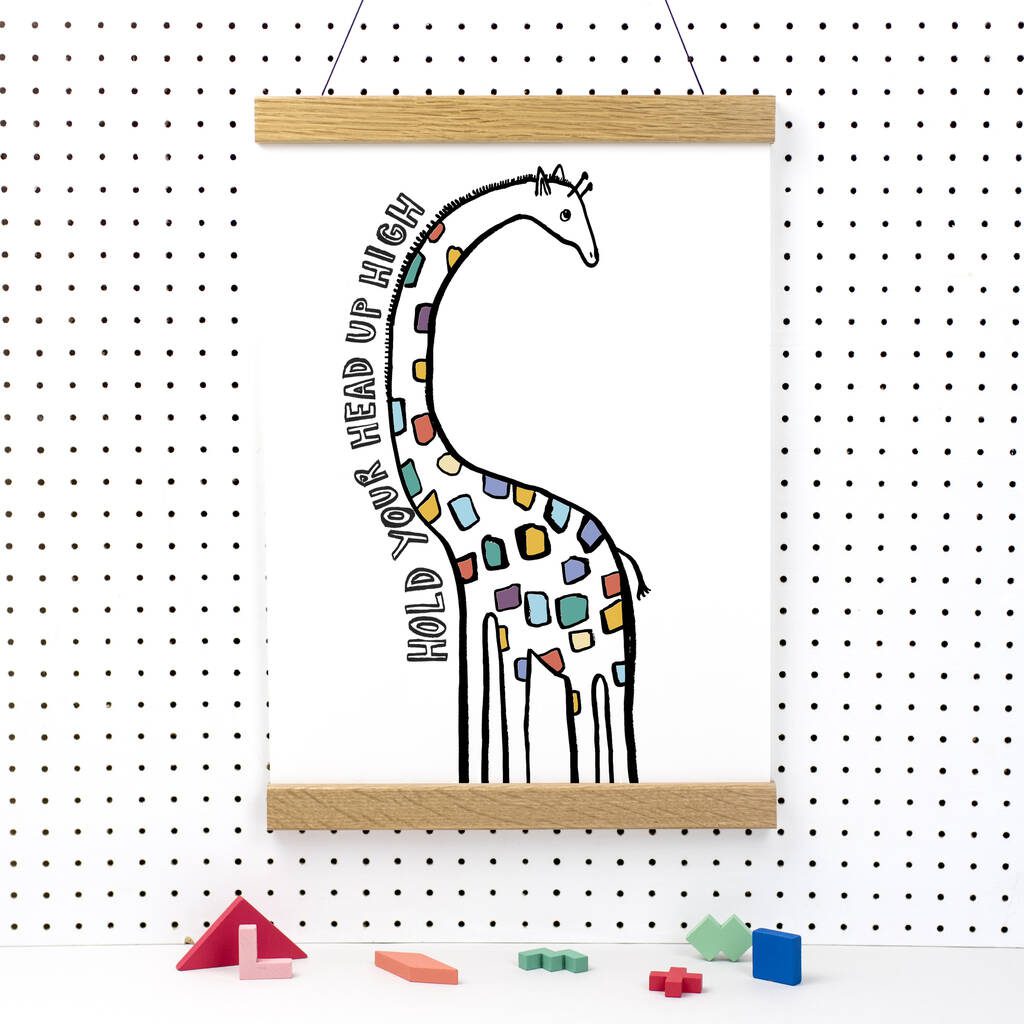 This giraffe rainbow print brings vibrant colors to any space. The soft hues create a joyful and uplifting atmosphere. Its unique design features a giraffe with a rainbow pattern, reminding anyone who sees it to “Hold your head up high!” This inspirational message encourages positivity, making it an ideal piece for any child’s room.