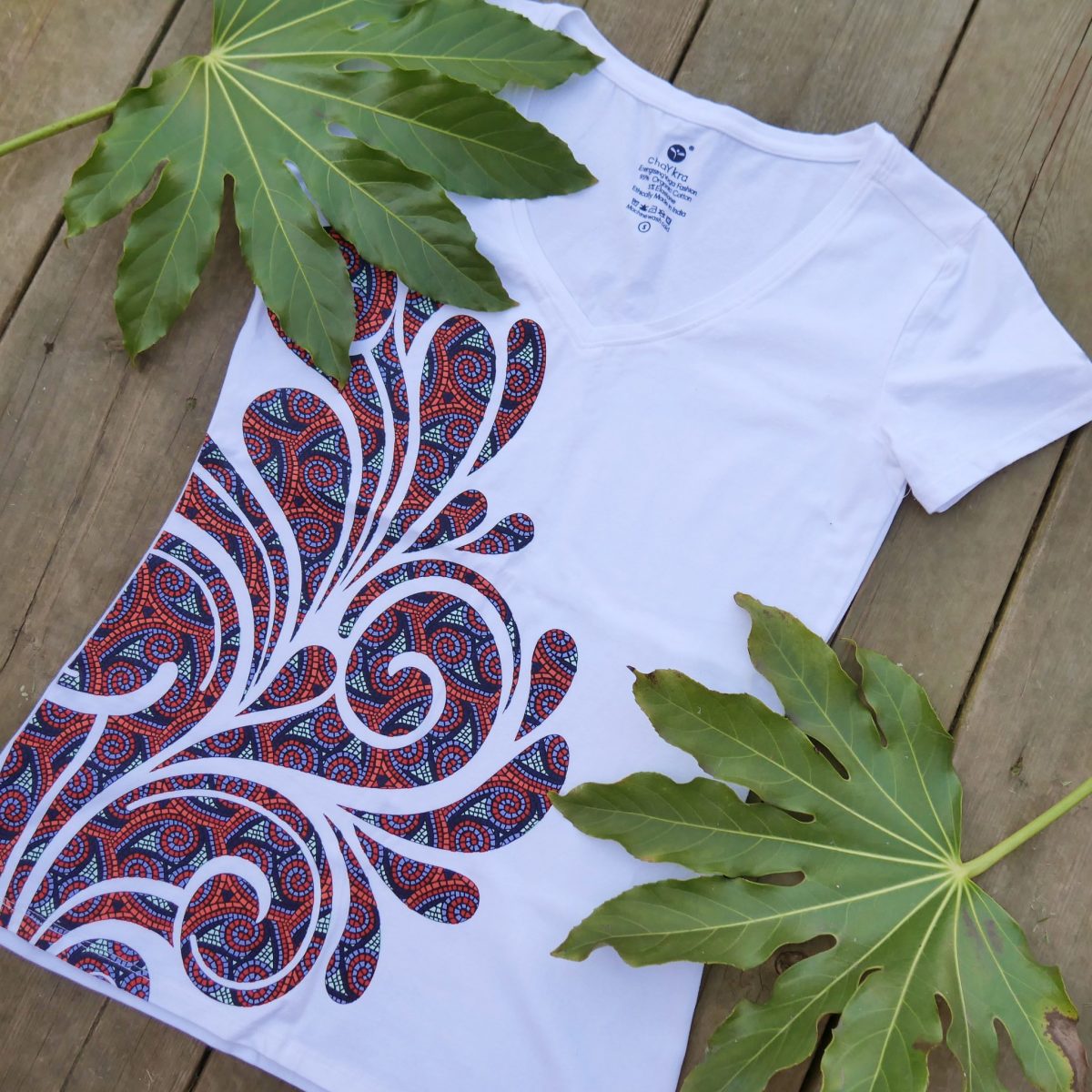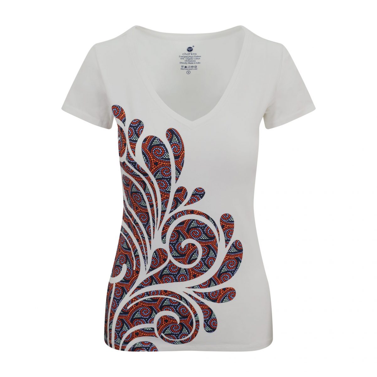 This v-neck organic cotton half sleeve yoga top offers a chic splash of Indian vibrancy. The stretch cotton fabric produces a comfortable, breathable feel. This bespoke swirl print is our signature design to symbolise the energising effect of yoga on the body.