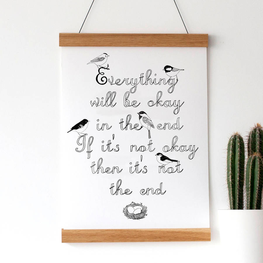The Everything Will Be Okay Print delivers a comforting and uplifting message, perfect for adding encouragement to any space. This beautifully designed typographic print features hand-drawn lettering that reads, “Everything will be okay in the end. If it’s not okay, then it’s not the end.” Tiny birds accompany the words, offering a reassuring presence that reminds you to stay hopeful. Whether placed in a bedroom, office, or living room, this print brings a sense of calm and motivation every day.