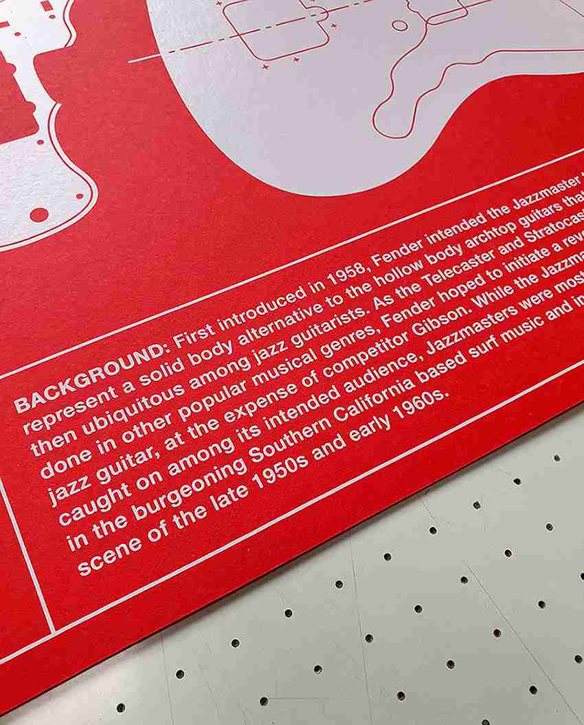 Fender Jazzmaster Guitar Print is available as a high-quality A2-sized poster, perfect for framing and display in any space. Printed on 310 gsm matte GF Smith Colorplan paper, it provides an elegant, museum-quality finish. The intricate details of the schematic stand out beautifully, making it a focal point in any room.