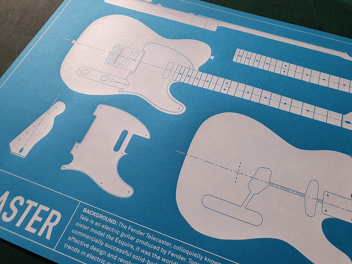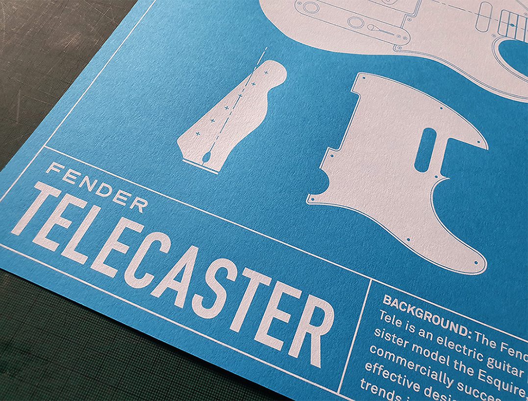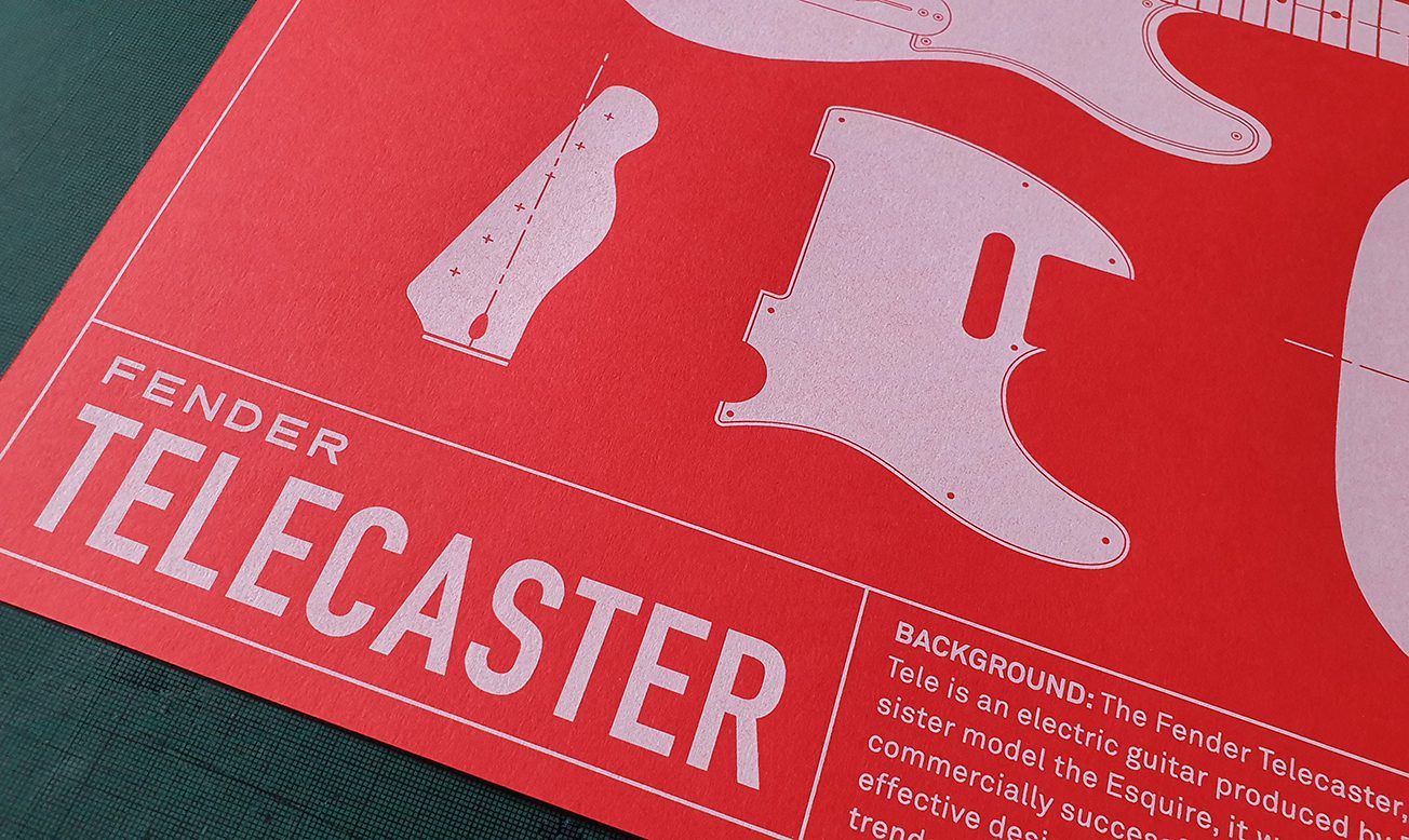 Fender Telecaster Guitar Screen Print features a carefully handcrafted design created using a traditional screen-printing technique on high-quality paper. Aditionally, the artwork is printed on premium 310 gsm matte GF Smith Colorplan paper, ensuring durability and vibrant colors. The available color variations include white on red, white on blue, and silver on black, providing different options for various aesthetic preferences. The crisp lines and fine detailing capture every aspect of the guitar with precision, highlighting its intricate design and creating a striking visual masterpiece. This hand-pulled print guarantees uniqueness and authenticity for art lovers and music fans alike.