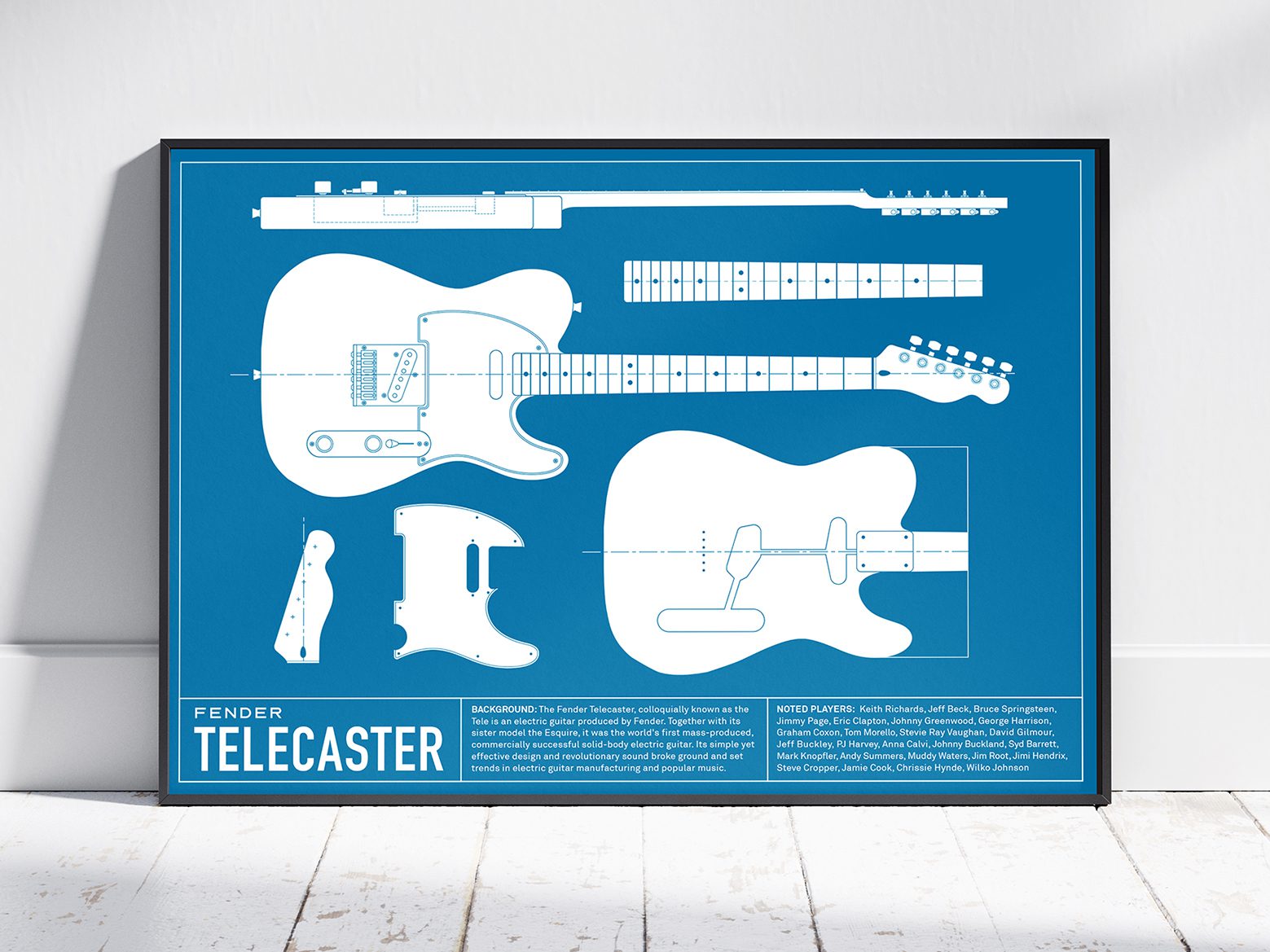 Fender Telecaster Guitar Screen Print captures the essence of an iconic instrument cherished by musicians worldwide for its distinct sound and history. The Telecaster debuted in 1952, revolutionizing music and shaping the sound of rock, pop, and country genres permanently. This screen print showcases an intricate hand-drawn blueprint that accurately represents the original schematic of this legendary guitar model. Beneath the detailed artwork, informative text provides historical context and highlights renowned musicians who played this timeless instrument. Collectors, guitarists, and music enthusiasts will appreciate this piece, making it a fantastic addition to any collection.