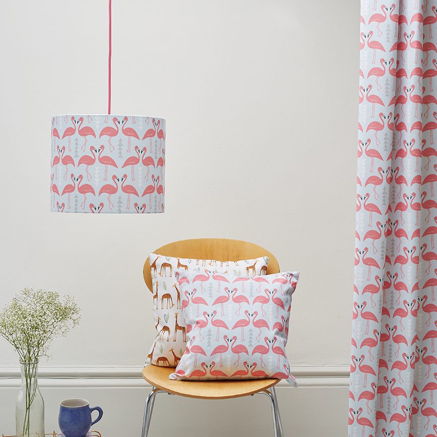 This fabric design began life as a sketch and was then transformed into digitally printed cotton. It has a pale blue background with vibrant pink flamingos and grey and white geometric detailing. It would work equally well in a bedroom, living room or hallway.