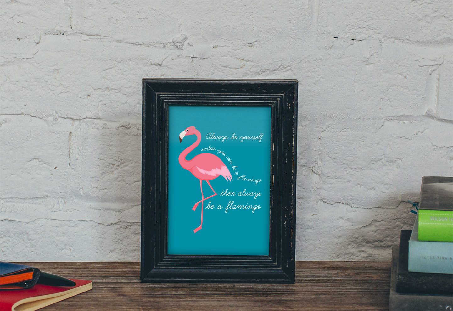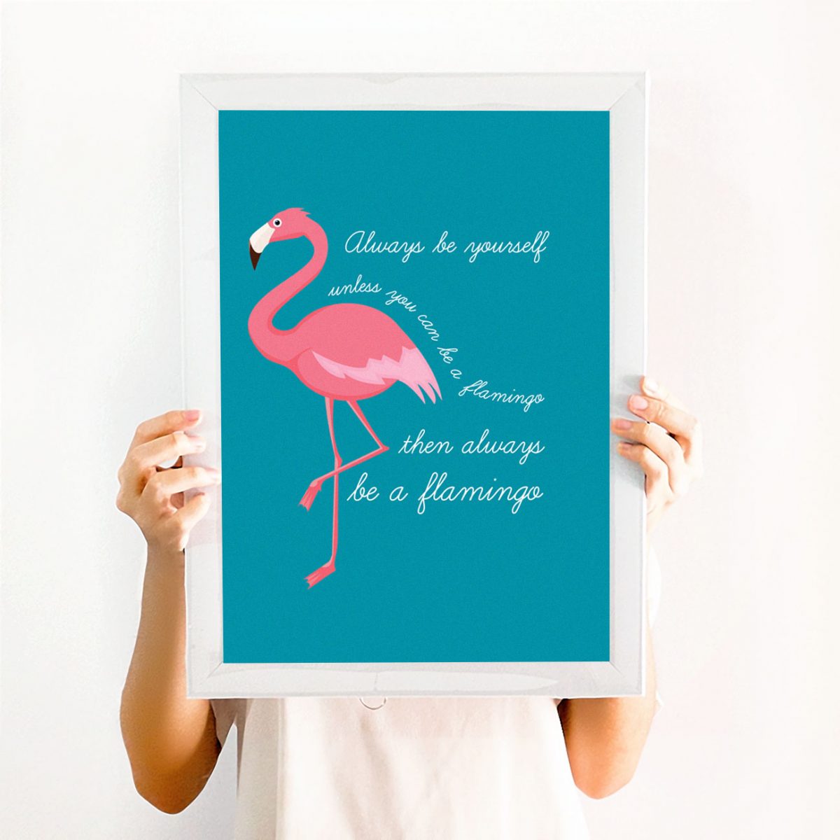 A teal blue flamingo print that reads – Always be yourself – unless you can be a flamingo then always be a flamingo