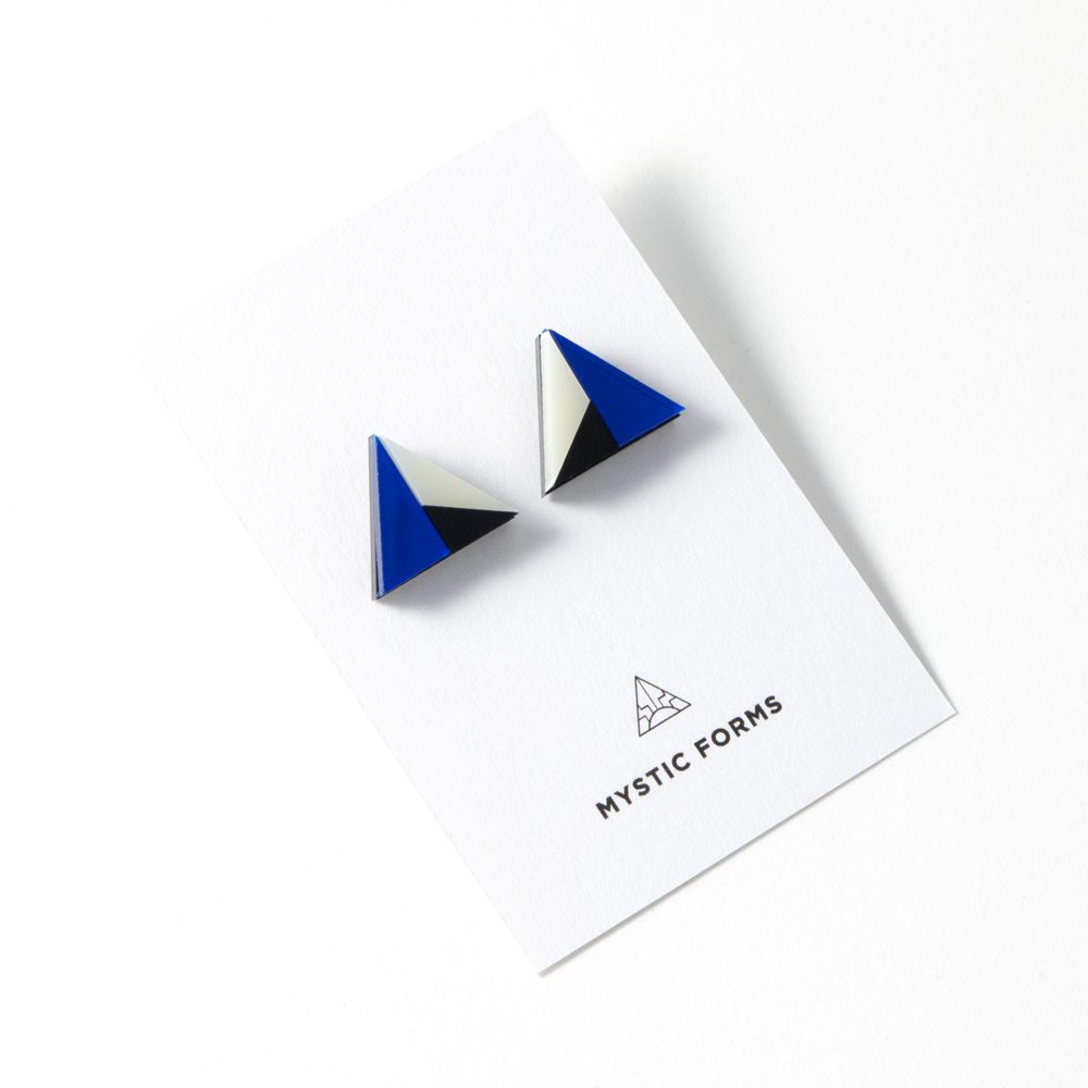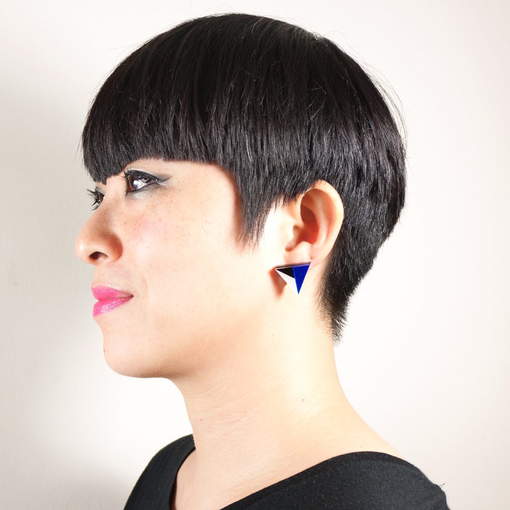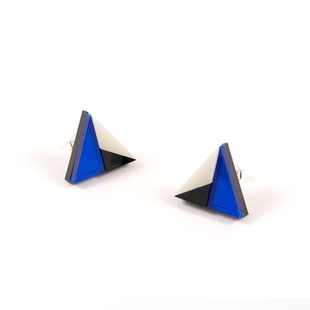 Geometric Perspex Statement Mini Studs Earrings hand made in London, UK. Comprised of laser cut and layered acrylic mirror in blue, matte black and ivory.