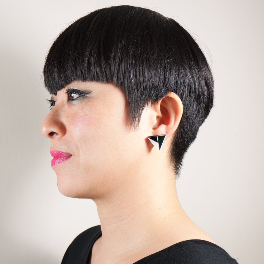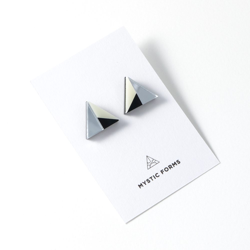 Geometric Perspex Statement Mini Studs Earrings hand made in London, UK. Comprised of laser cut and layered acrylic mirror in silver, matte black and ivory.