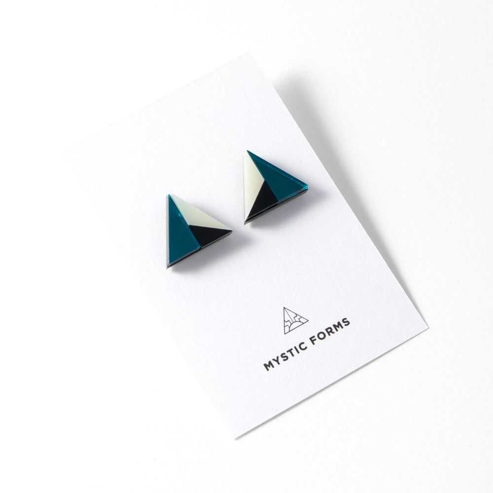 Geometric Perspex Statement Mini Studs Earrings hand made in London, UK. Comprised of laser cut and layered acrylic mirror in teal, matte black and ivory.