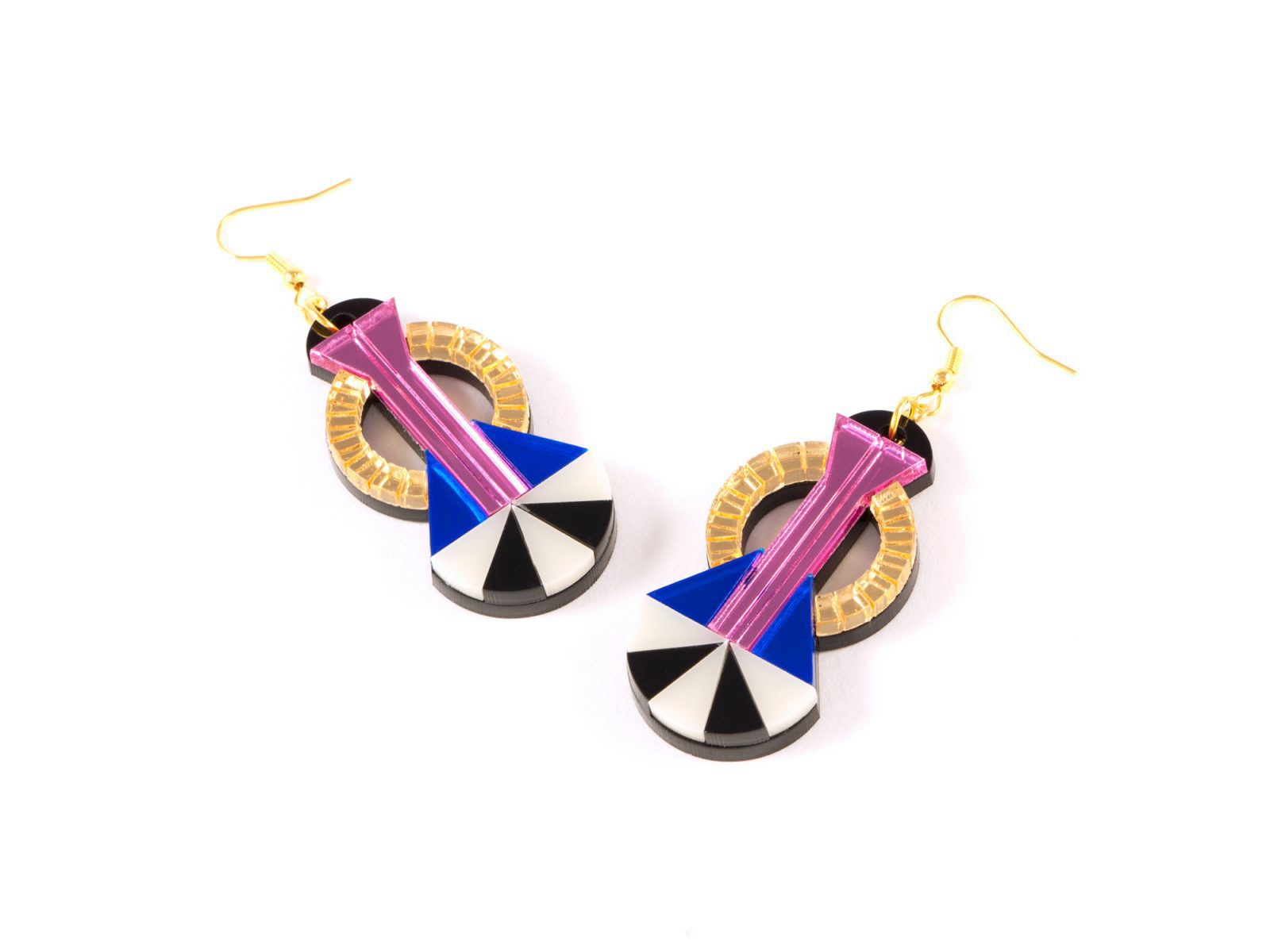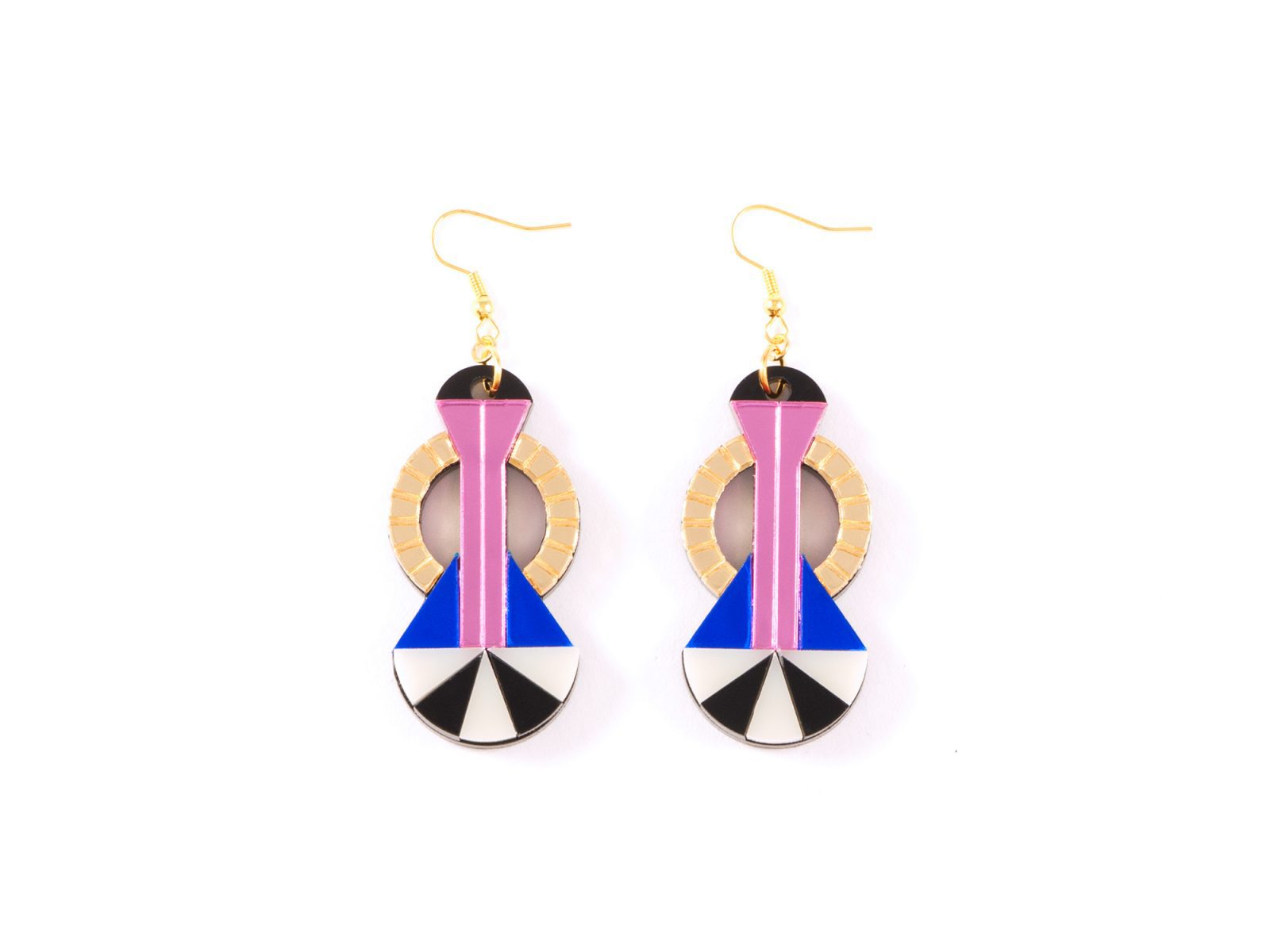 Comprised of laser cut and layered acrylic mirror in gold, babypink and blue.