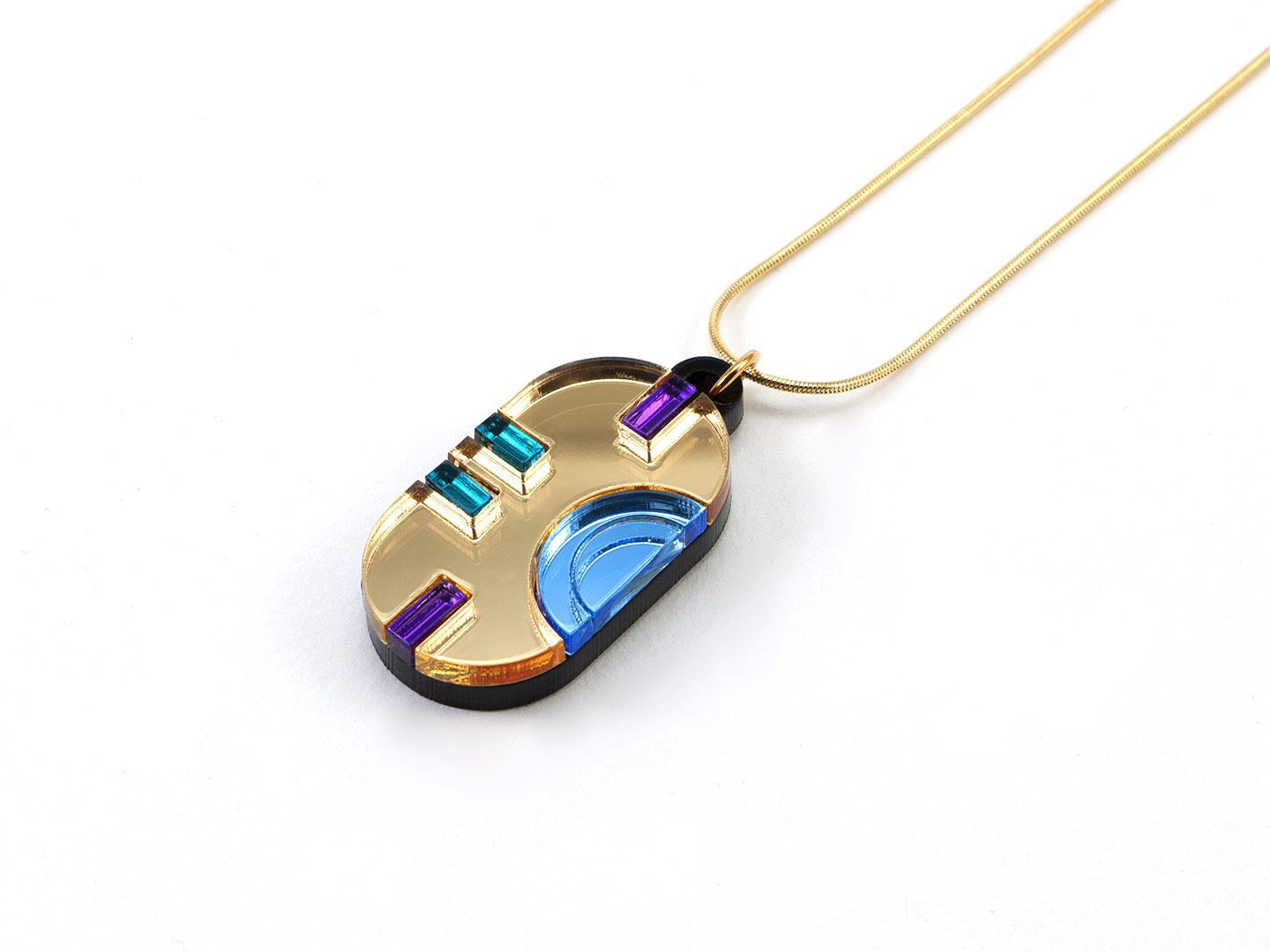 Comprised of laser cut and layered acrylic mirror in gold, ice blue, teal and purple.