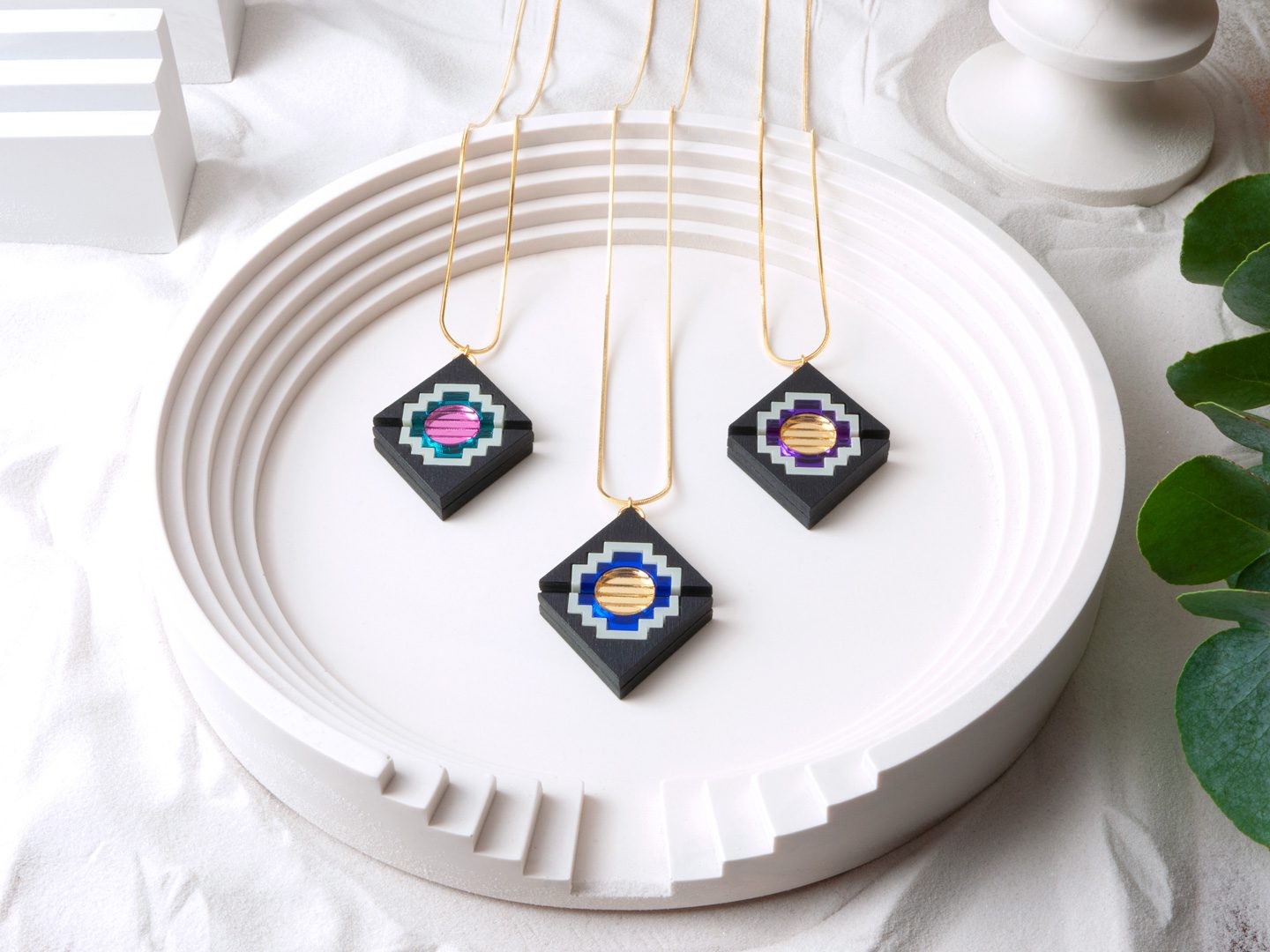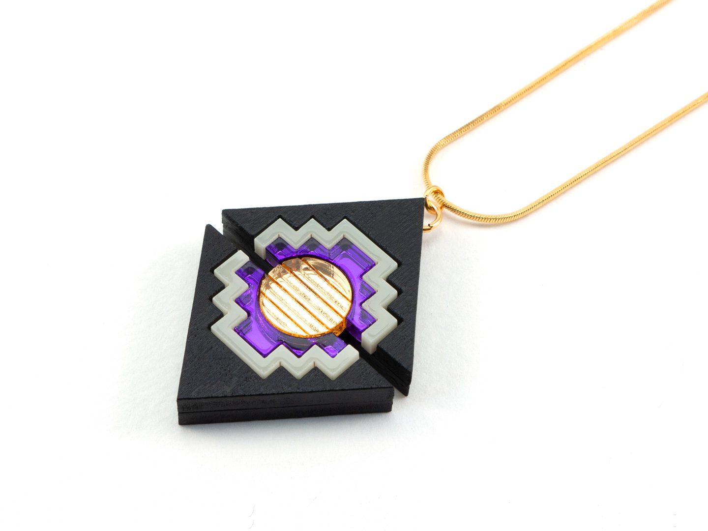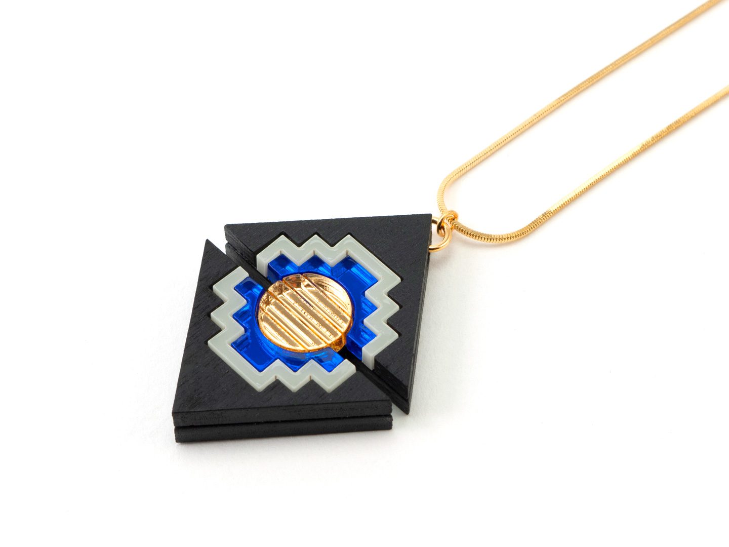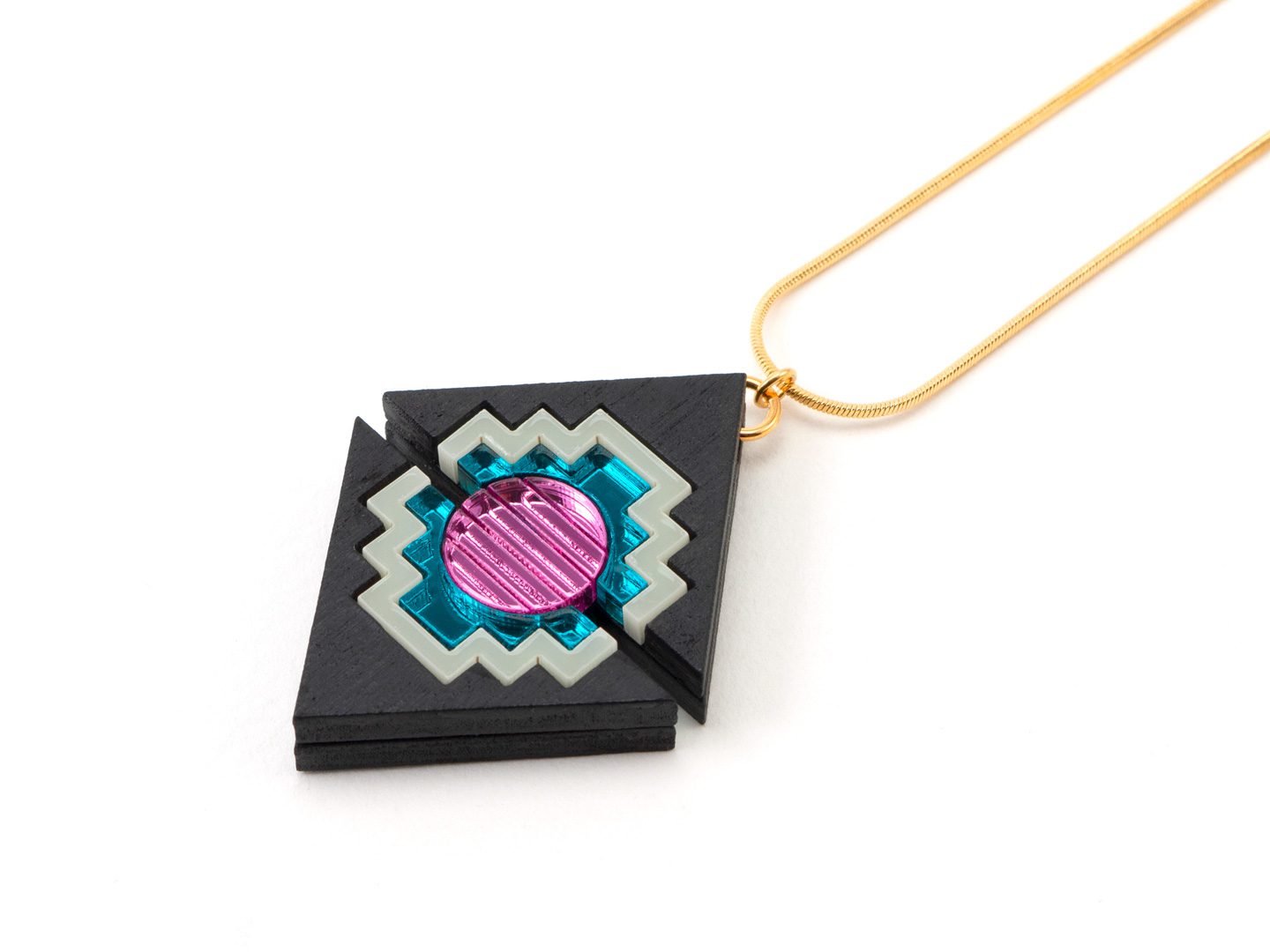 Comprised of laser cut and layered acrylic mirror in a choice of colours and painted wood (FSC Certified) in black (matte varnish finish).