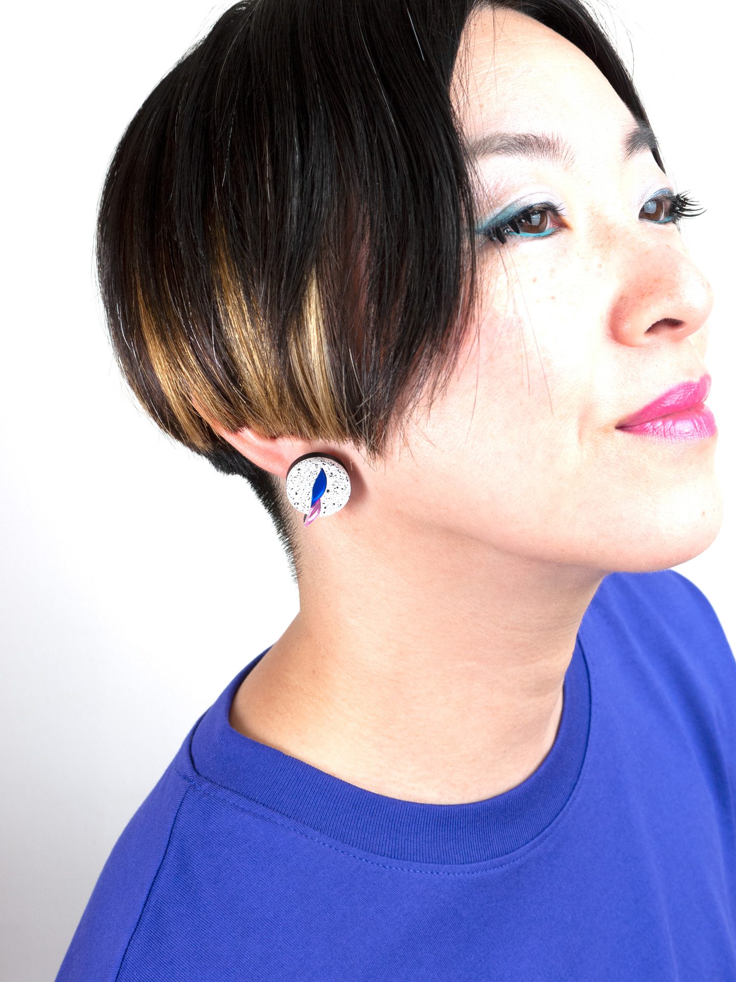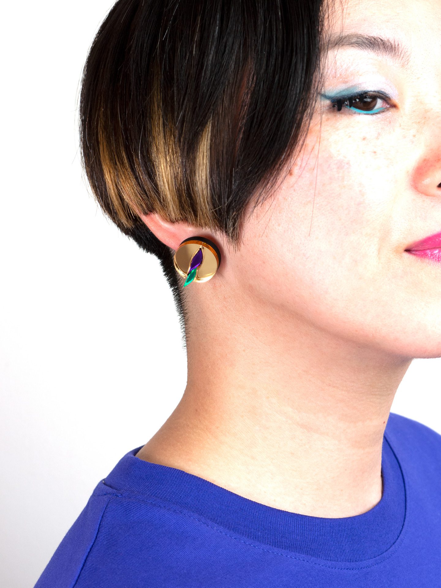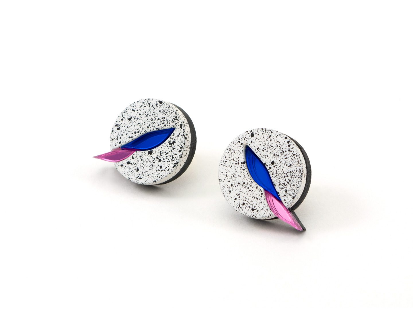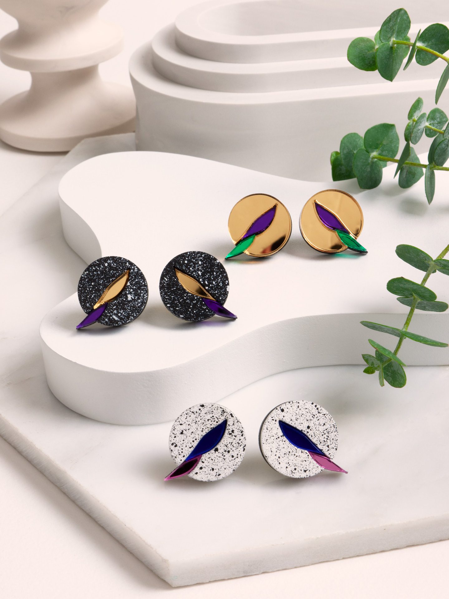 Geometric Perspex Statement Mini Earrings hand made in London, UK. Available in White/Blue/Baby pink, Gold/Purple/Green.