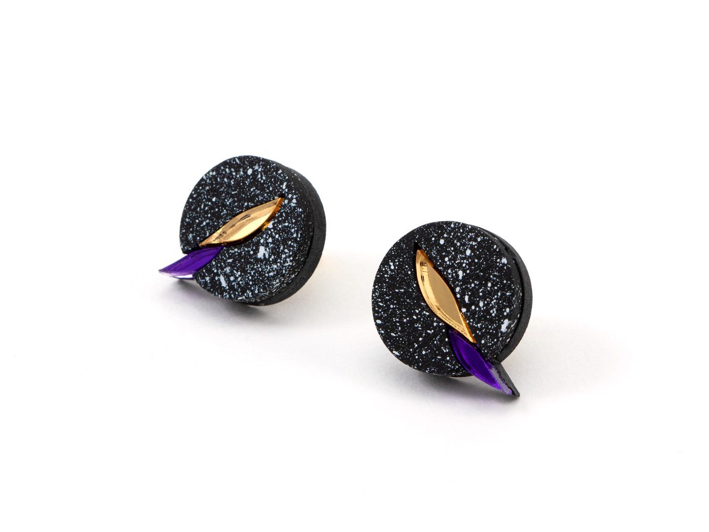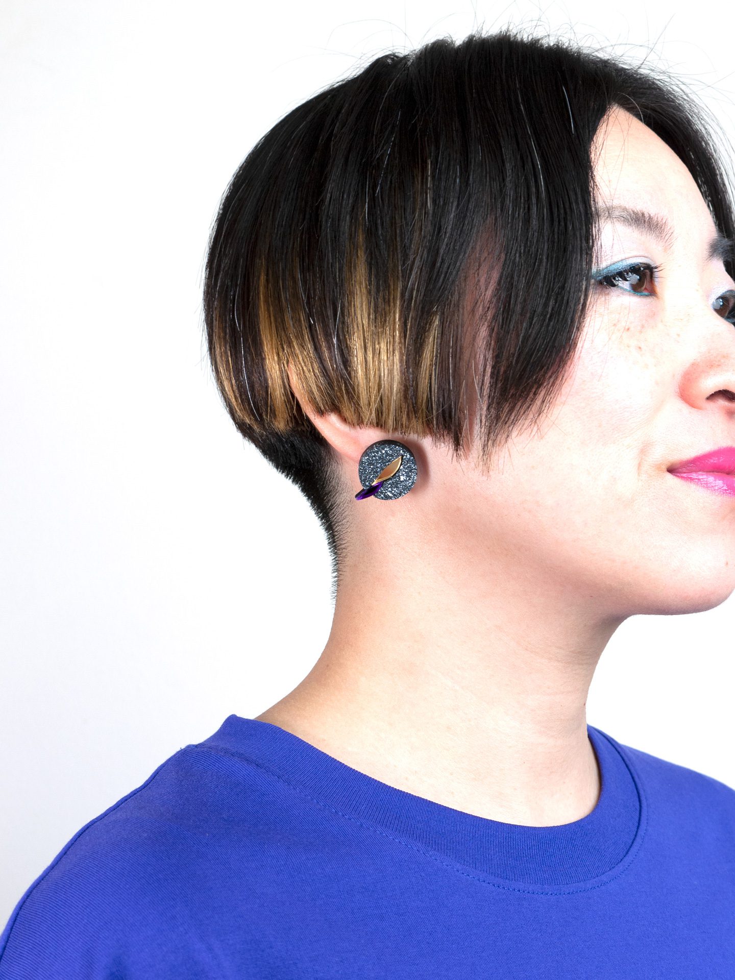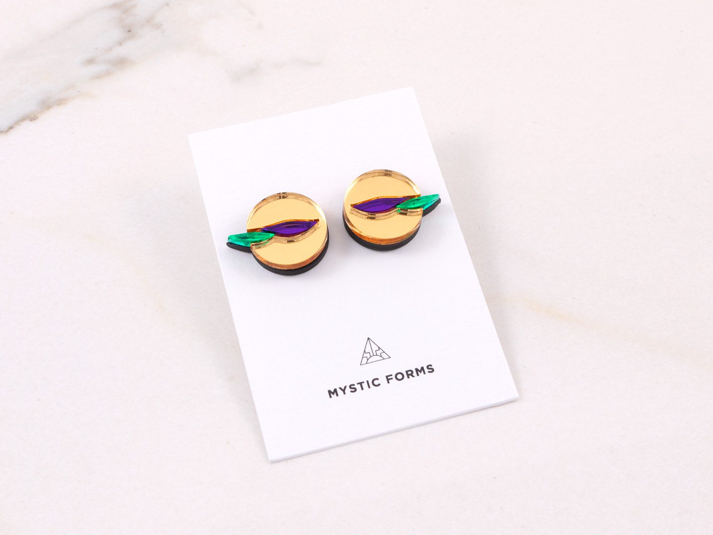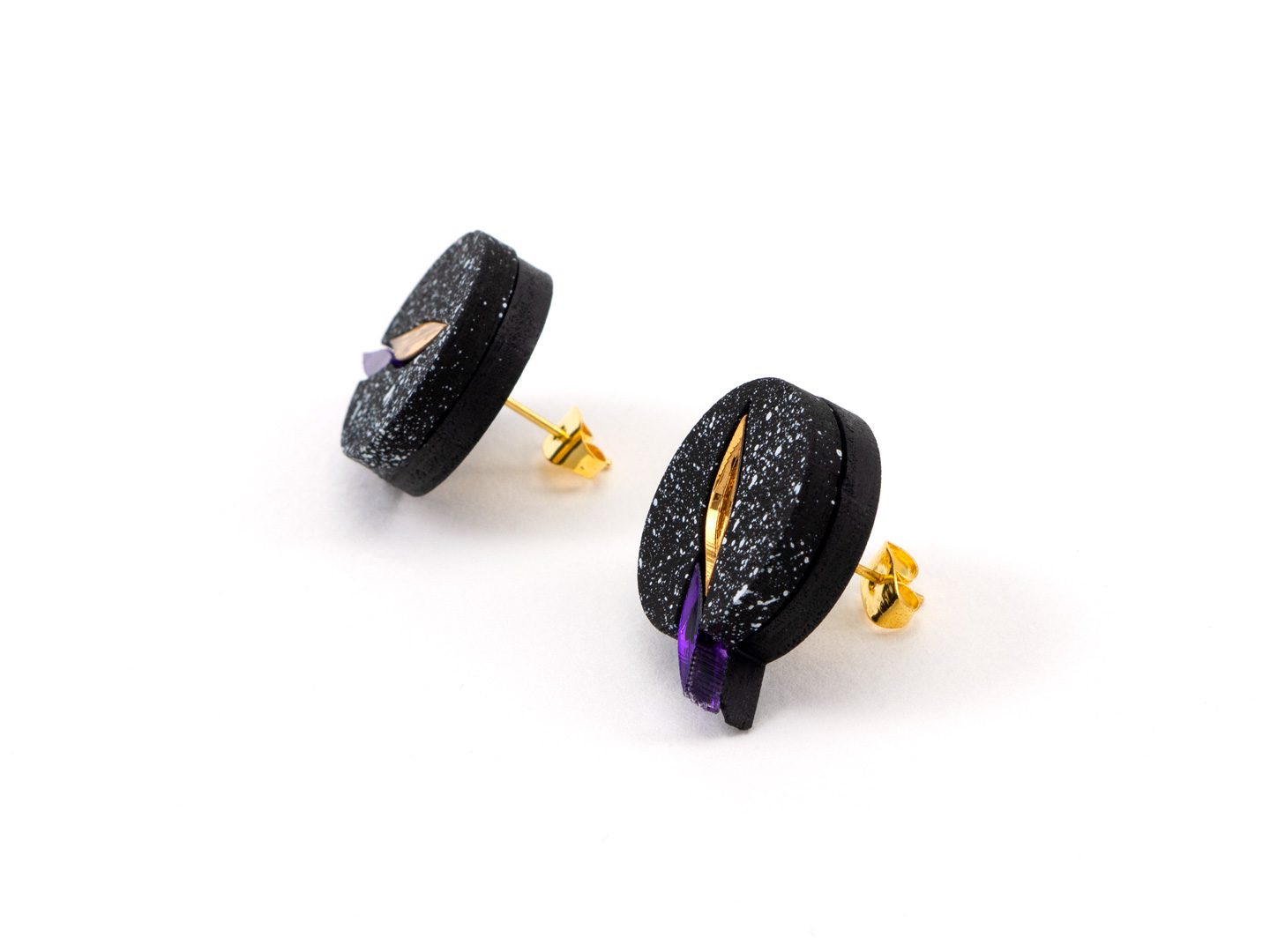 Geometric Perspex Statement Mini Earrings hand made in London, UK. Available in White/Blue/Baby pink, Gold/Purple/Green.