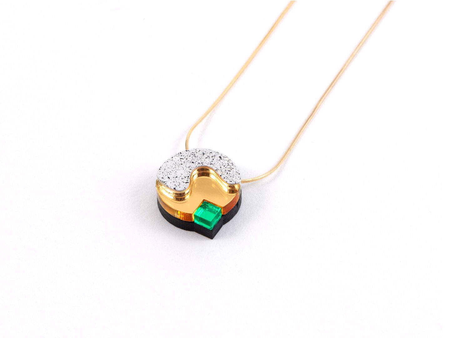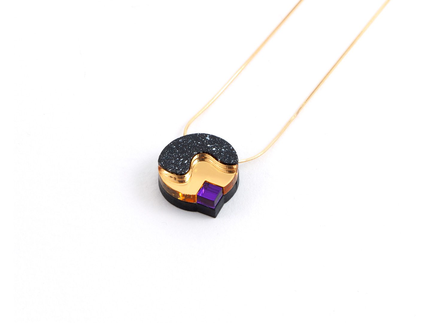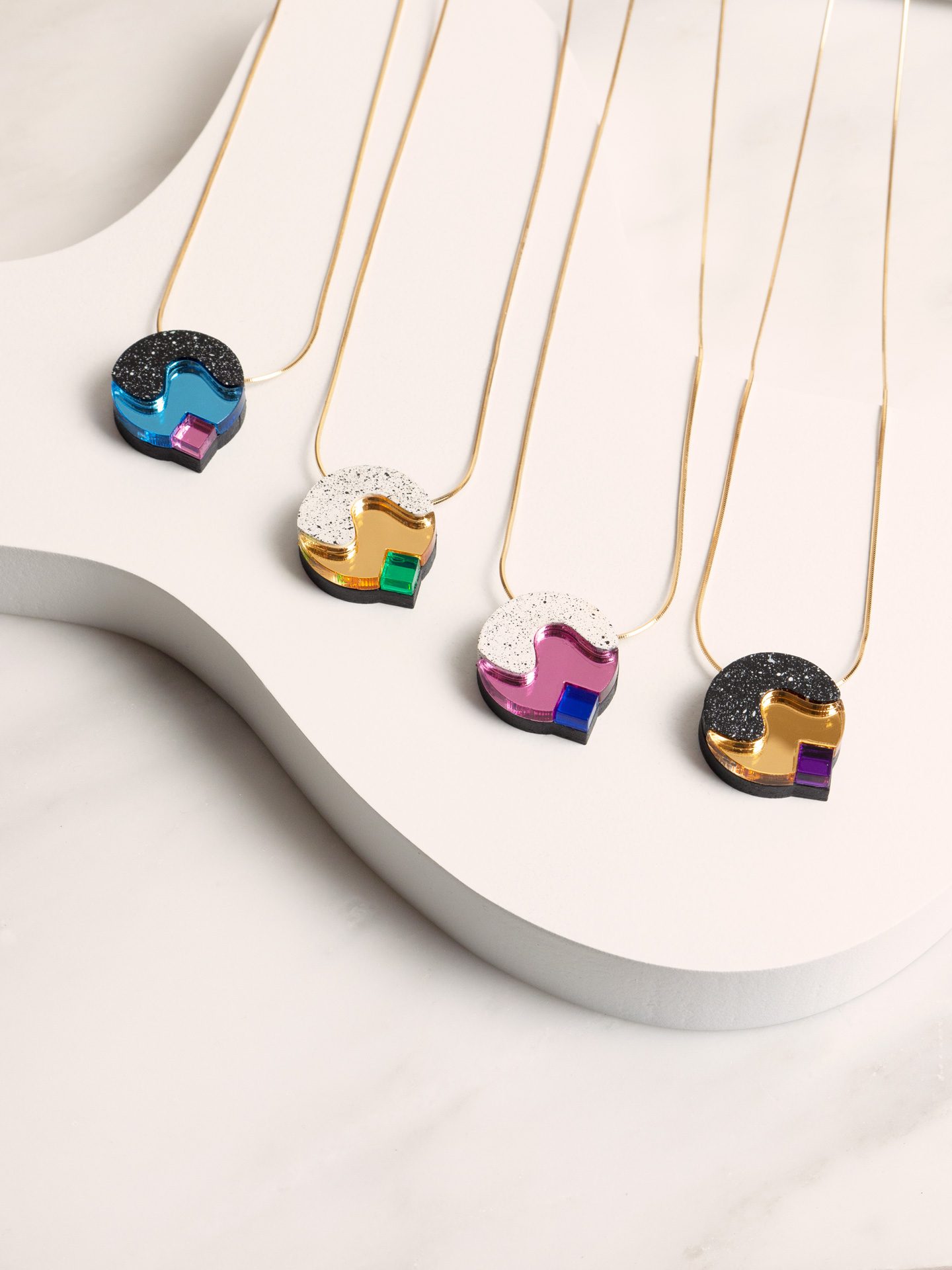 Comprised of laser cut and layered acrylic mirror in choice of colours and hand painted wood (FSC Certified) in white with small black dots and black (matte varnish finish).
