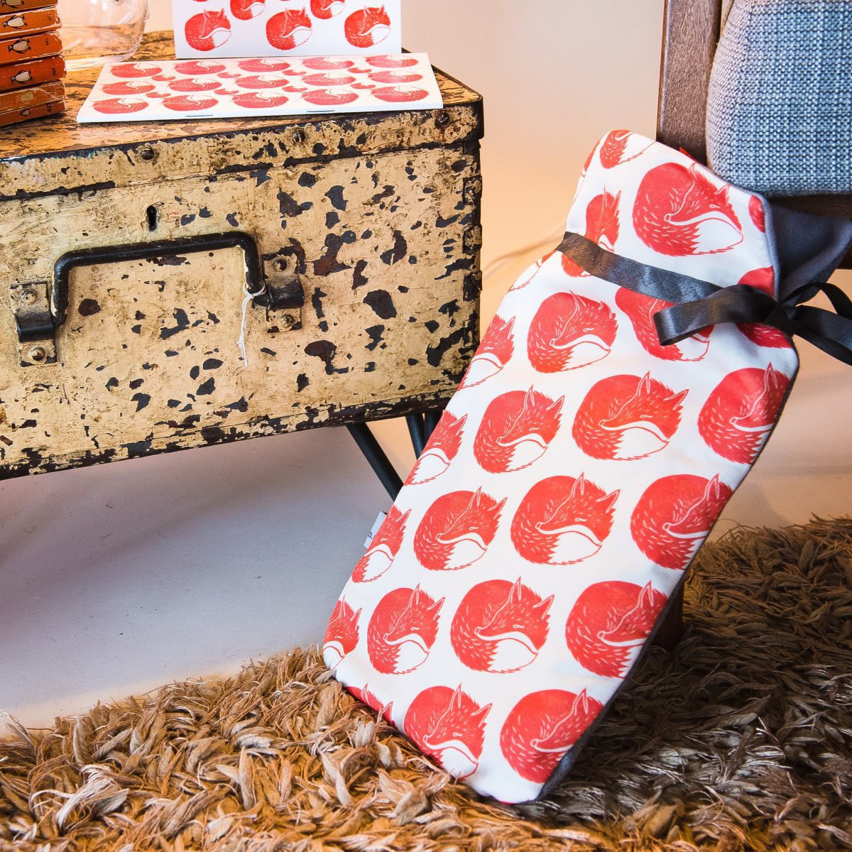 This chipper hot water bottle features our wonderful sleepy fox design, printed onto a medium weight cotton drill and lined with fleece. This hot water bottle is printed on one side and has a plain complementary fabric on the other with ribbon tie at the top.