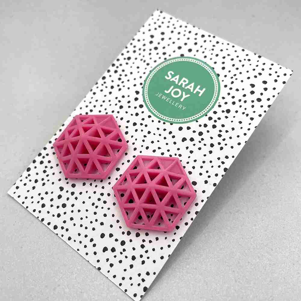 Geometric Hexagon Stud Earrings. Striking and stylish hexagonal design 3D printed in lightweight resin. Available in a range of vibrant colours.