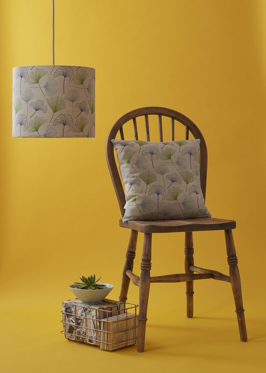 The design features hand drawn gingko leaves, the colours of which contrast beautifully with the natural colour of the linen.