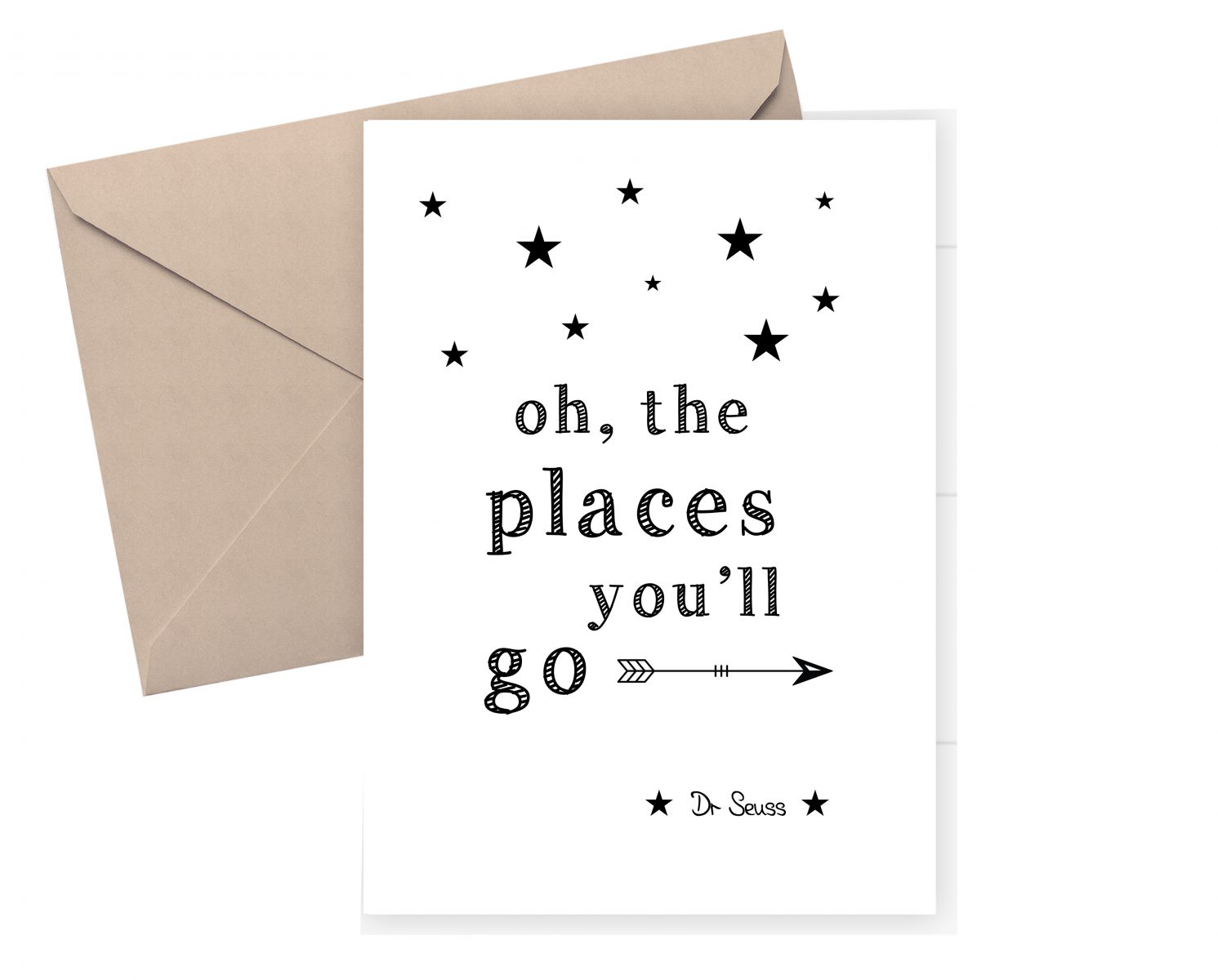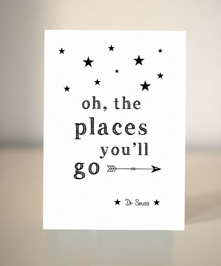 Who didn’t read Dr Seuss as a child. I know most of us did. Oh, the Places You’ll Go! is a book written and illustrated by Dr. Seuss. This black and white card is a perfect card for someone going on a trip, a good luck card or a graduation card.