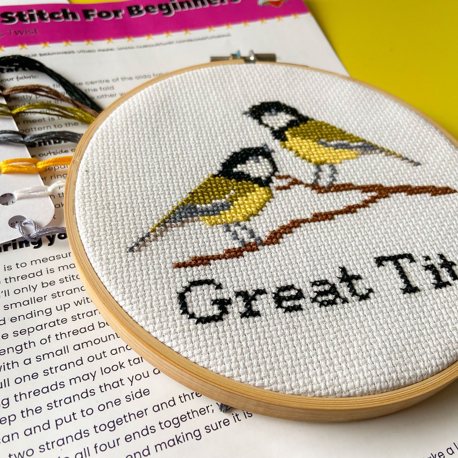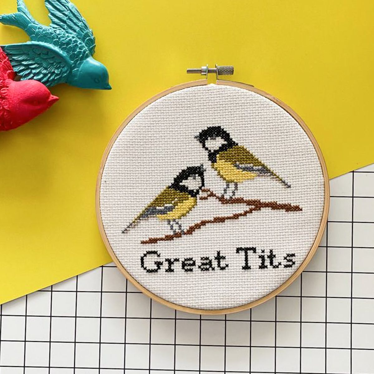 Inside your “Great Tits” cross stitch kit, you’ll find everything you need to create a hilarious and beautiful piece of art: