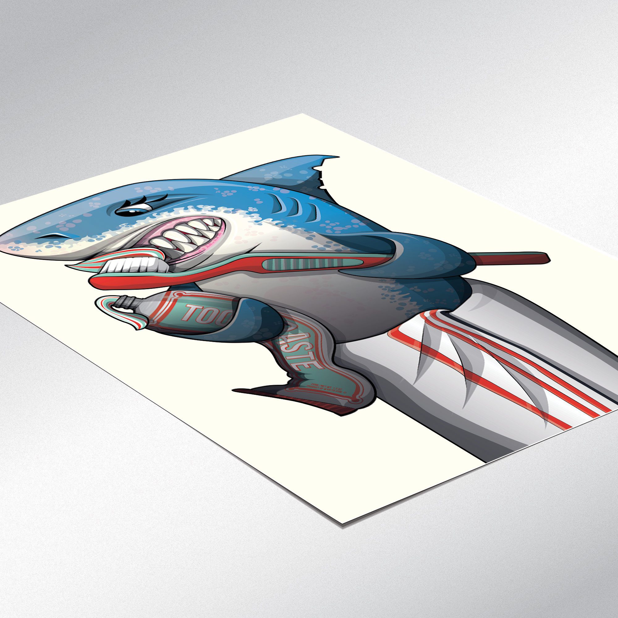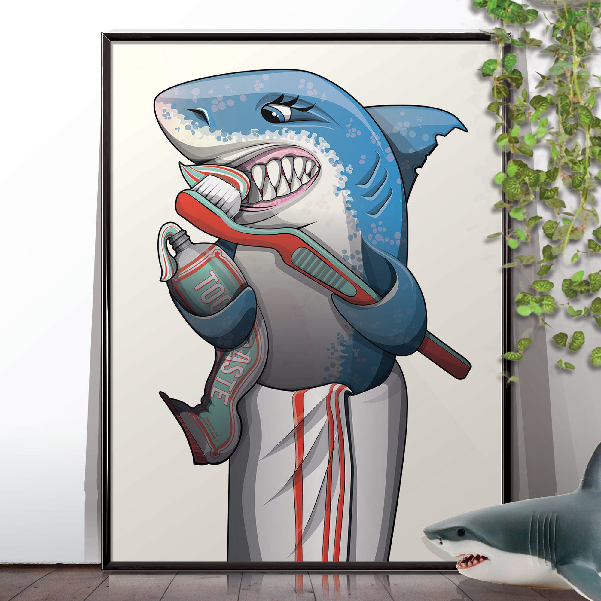Shark cleaning teeth with toothpaste, art print for your bathroom.