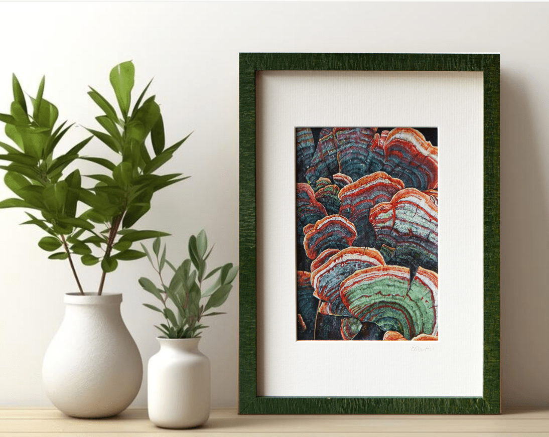 This A4 giclée print is perfect for nature lovers, mushroom enthusiasts, or anyone seeking unique, symbolic wall art. Whether you’re looking to add a touch of nature to your home or give a thoughtful, eco-inspired gift, this Green Turkey Tail Mushroom print is an ideal choice for its beauty, craftsmanship, and natural symbolism