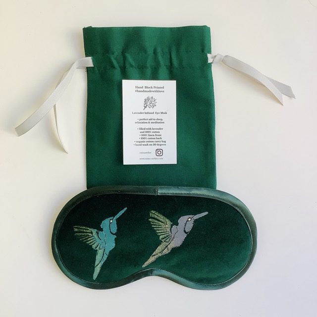 Indulge in luxury with the Raina Atelier Green Velvet Hummingbirds Eye Mask, hand block printed on sumptuous 100% cotton velvet.