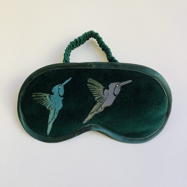 Luxury Green Velvet Lavender Infused Eye Sleep Mask with Hummingbirds Original Linocut Design; to aid sleep, relaxation, meditation or for traveling
