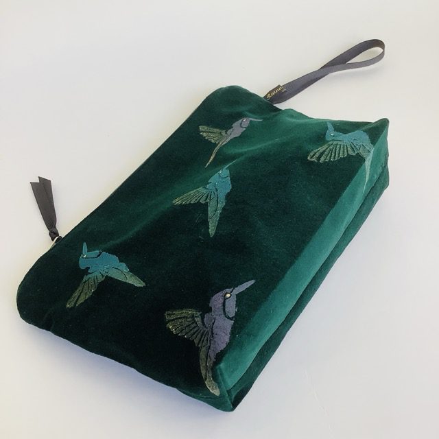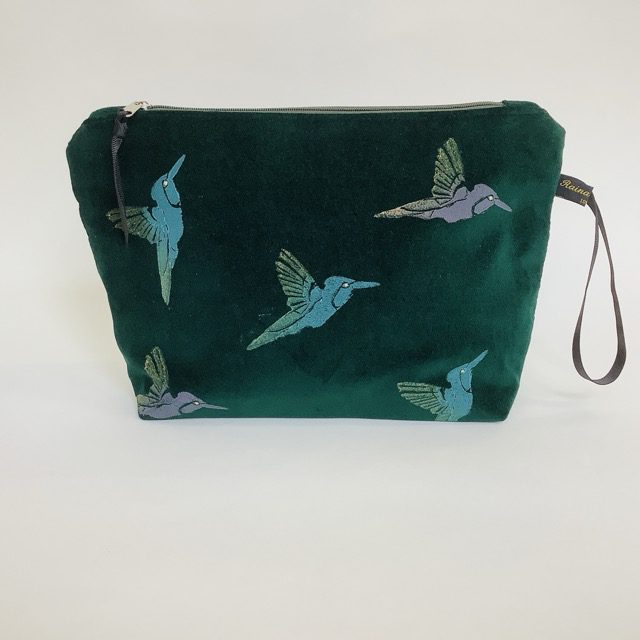 Introducing Raina Atelier Green Hummingbirds Velvet Makeup Bag, an exquisite addition to your daily makeup routine and unique art accessory.
