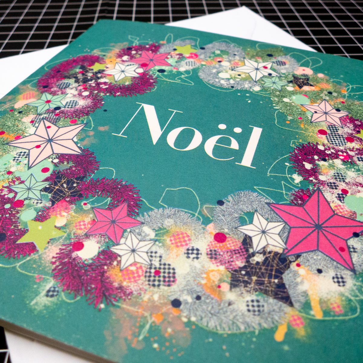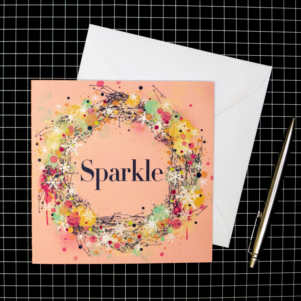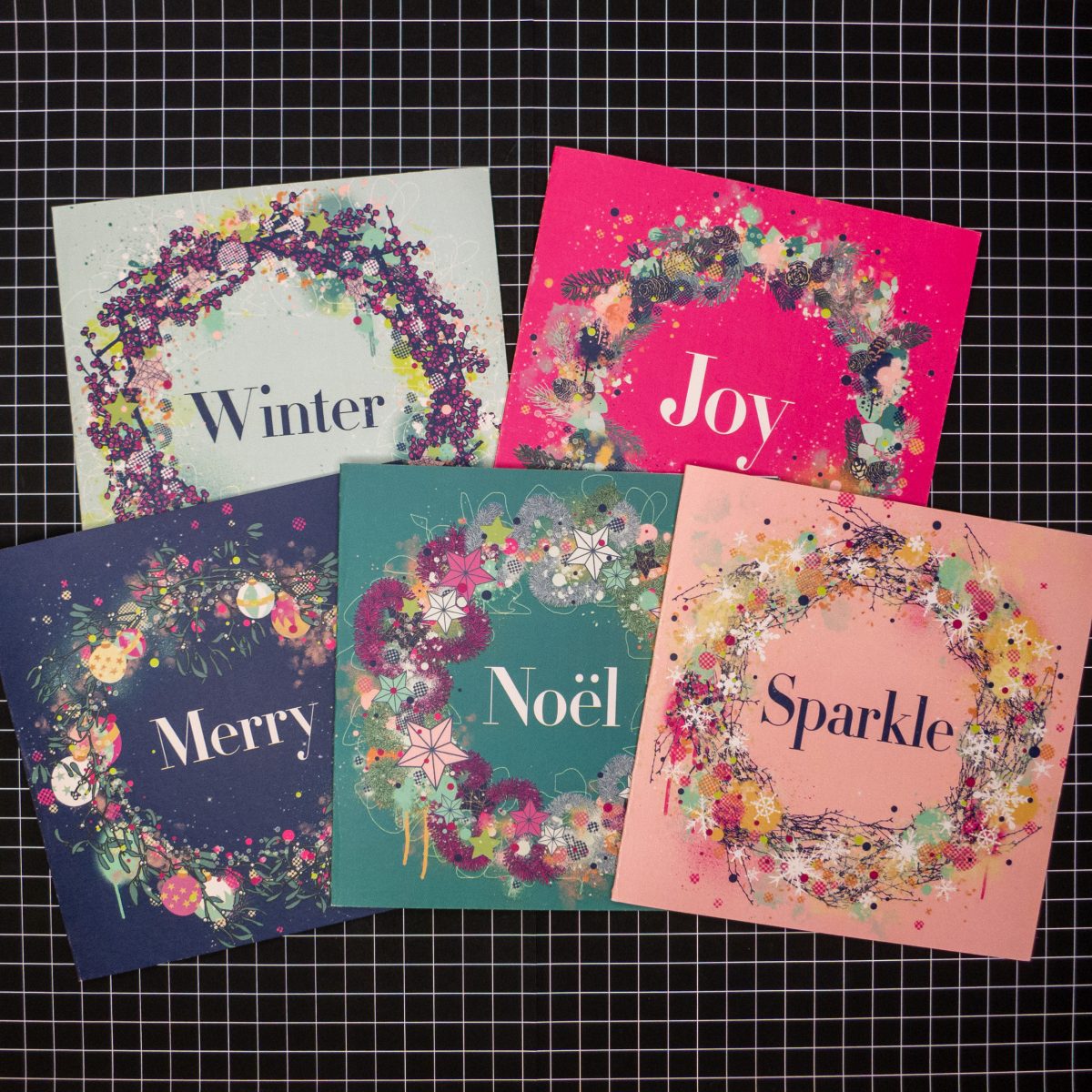 The designs are called; ‘Joy’, ‘Winter’, ‘Sparkle’, ‘Merry’ and ‘Noël’ and are a combination of traditional Christmas motifs like pine fronds, mistletoe and tinsel alongside some more contemporary expressive abstract mark-making. Street Art meets traditional Christmas in fun, energetic illustrations!