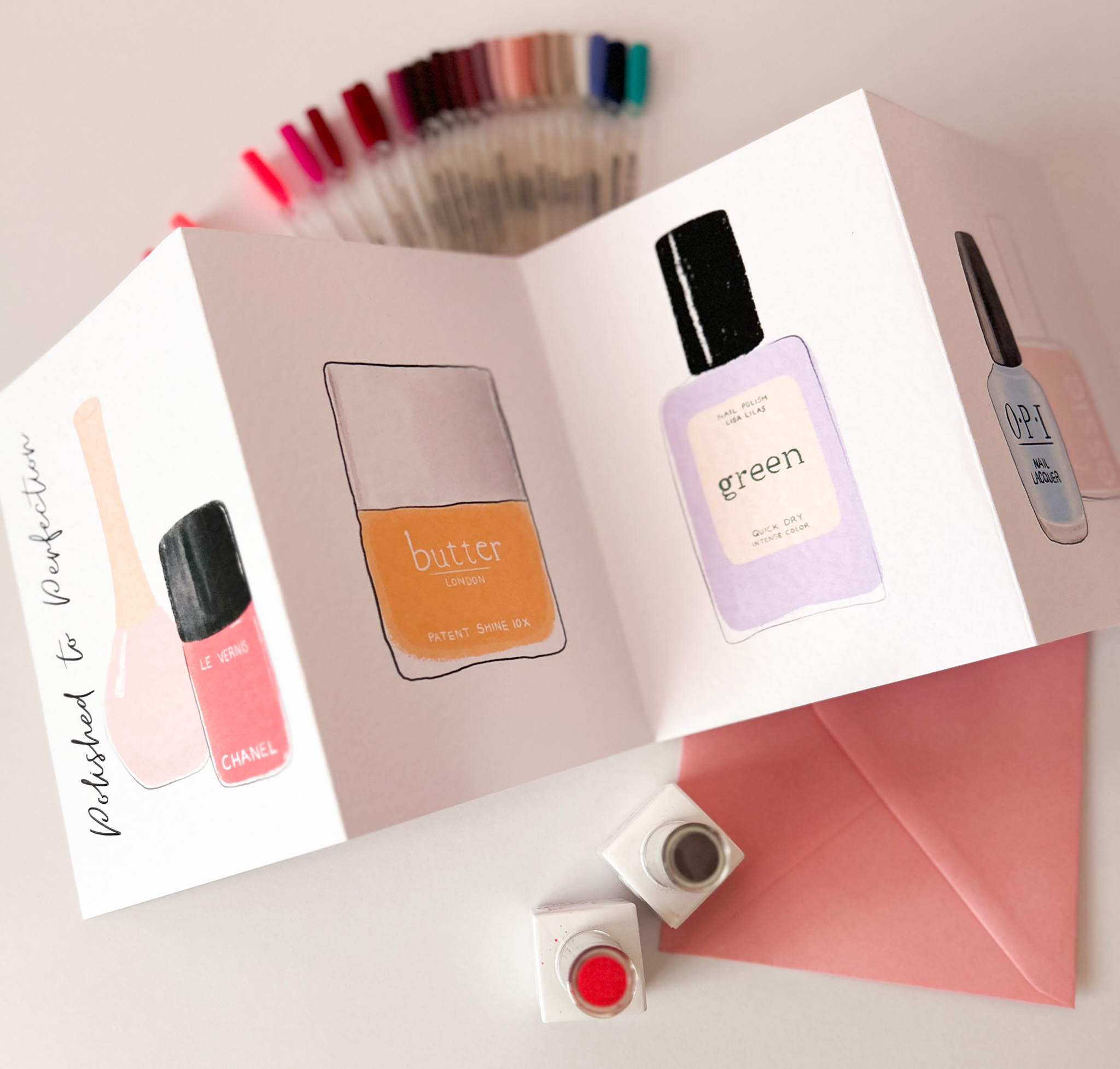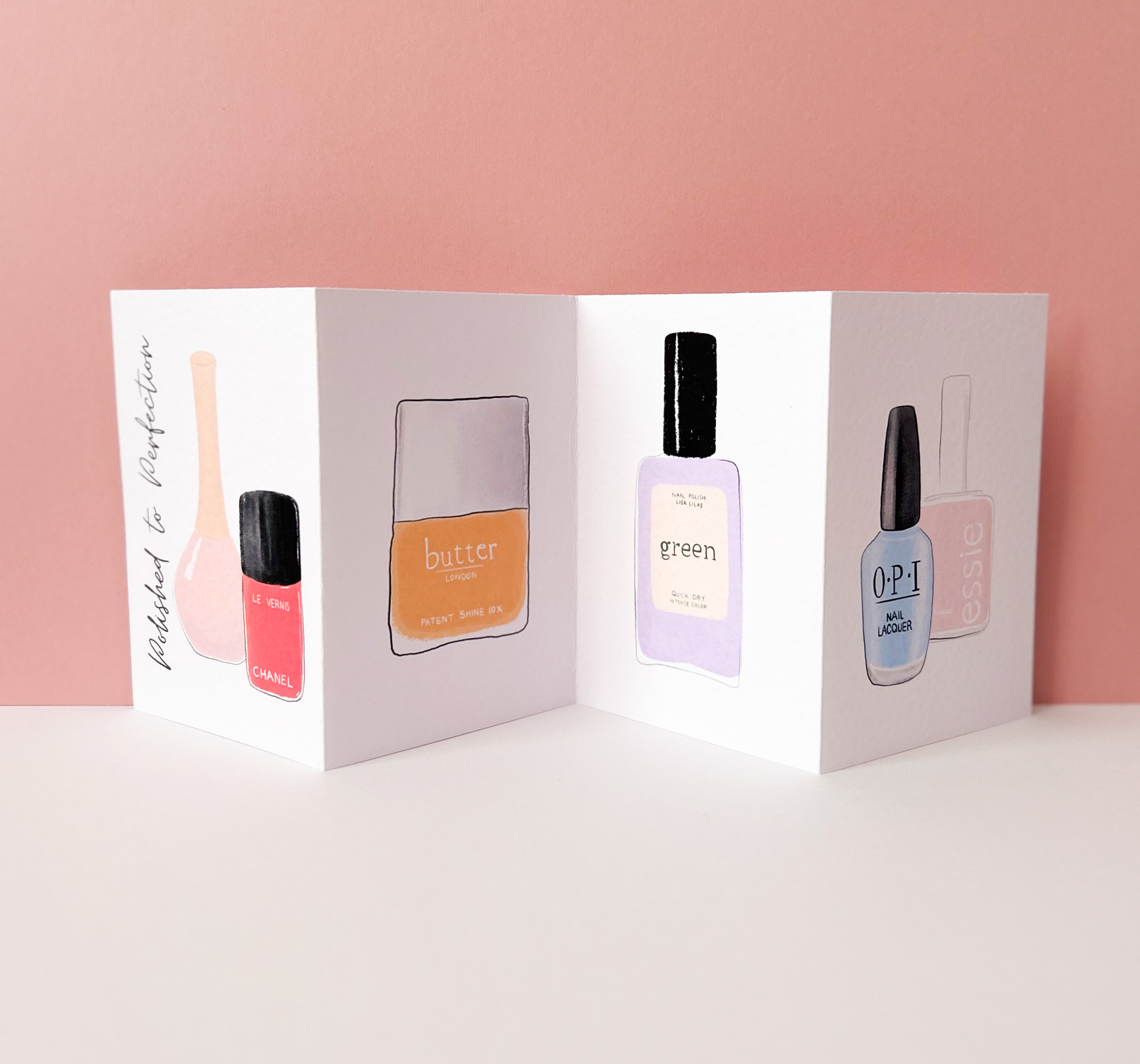 Delight the beauty enthusiast in your life with this stunning handmade concertina greeting card, featuring elegant illustrations of iconic nail polish bottles. Each panel showcases a carefully hand-drawn and printed design, highlighting the vibrant colours and sleek shapes of beloved nail polish brands.