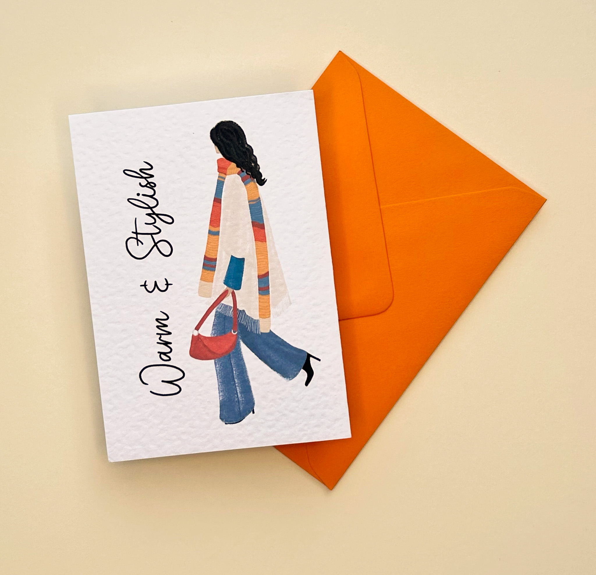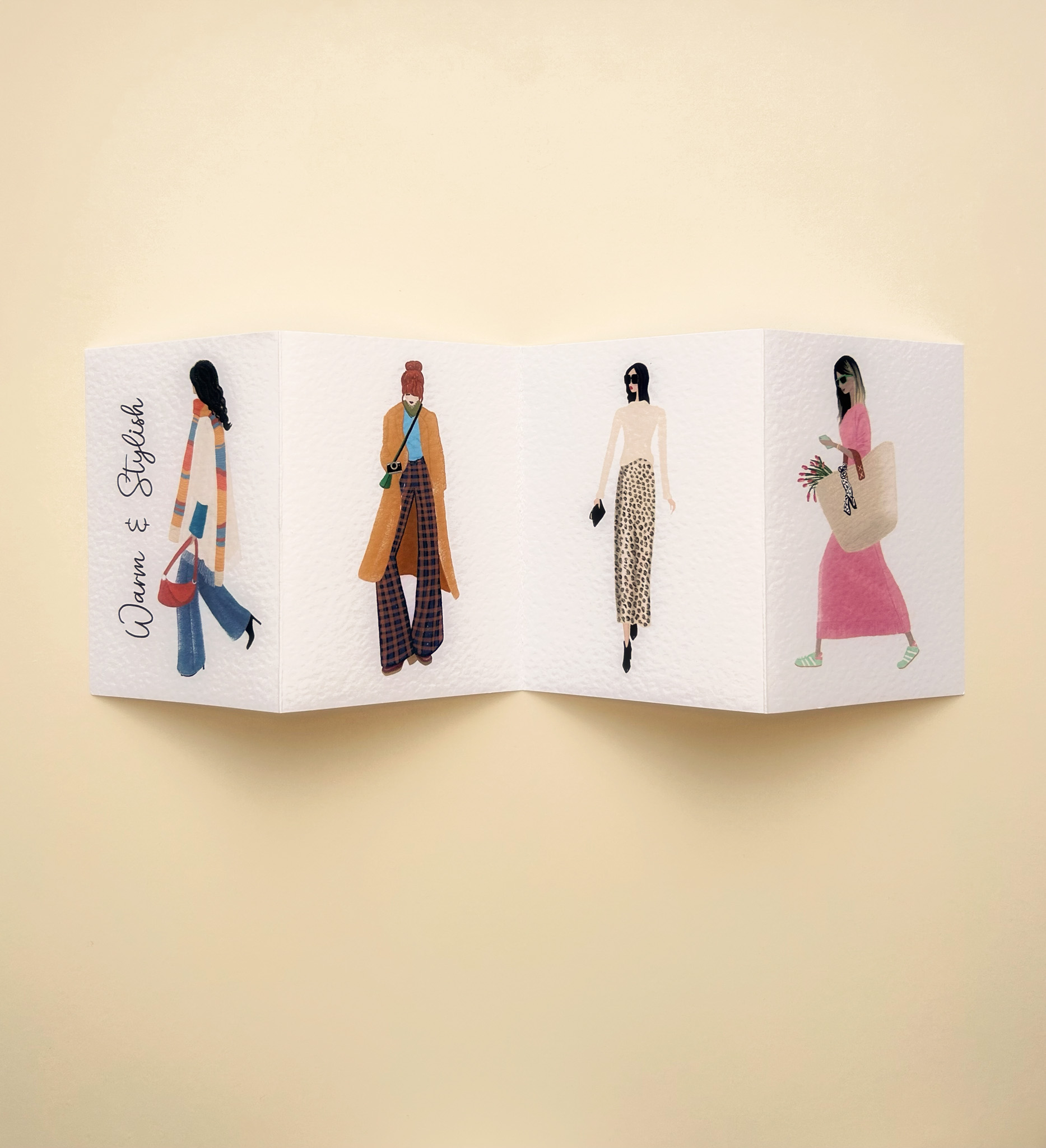 Celebrate the cosy charm of the colder seasons with our ‘Warm & Stylish’ handmade concertina card, featuring stylish hand drawn printed illustrations of girls dressed in the season’s trendiest outfits. From cosy knits to layered scarves and boots, each panel showcases an effortlessly chic look inspired by the warm tones and textures of fall fashion.