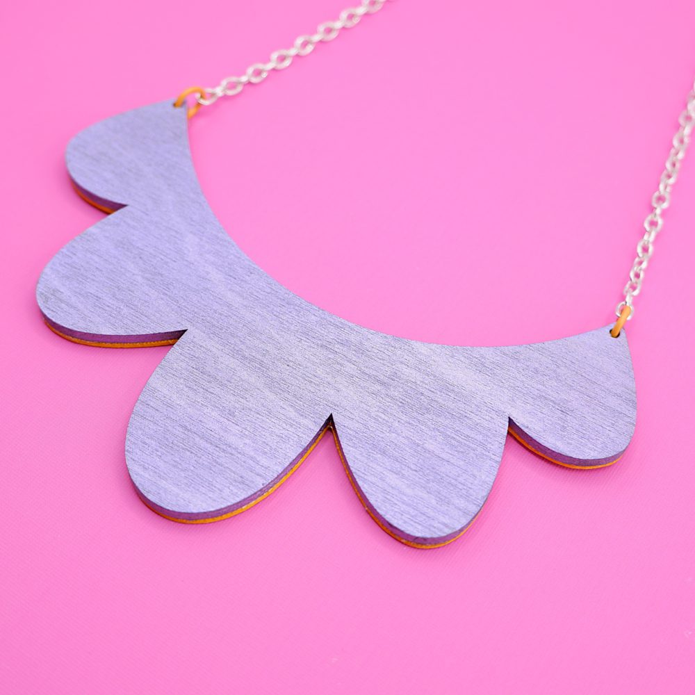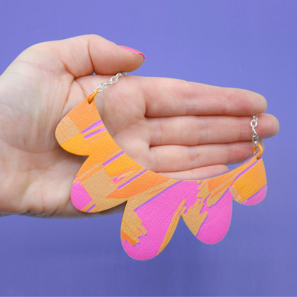 The fabric design is bursting with vibrant energy, combining bold streaks of pink and orange with hints of lavender for a playful, abstract aesthetic. The reverse is comprised of a chunky layer of birch and poplar plywood that I sourced from a lovely company based in Cambridgeshire. To give it the Sophie Kate Creates twist I paint the ply with this gorgeous metallic purple water-based paint. It really makes the necklace pop! It is important to me that this statement necklace is lightweight, ensuring it’s comfortable to wear all day long – so the construction is as important to me as the design itself.