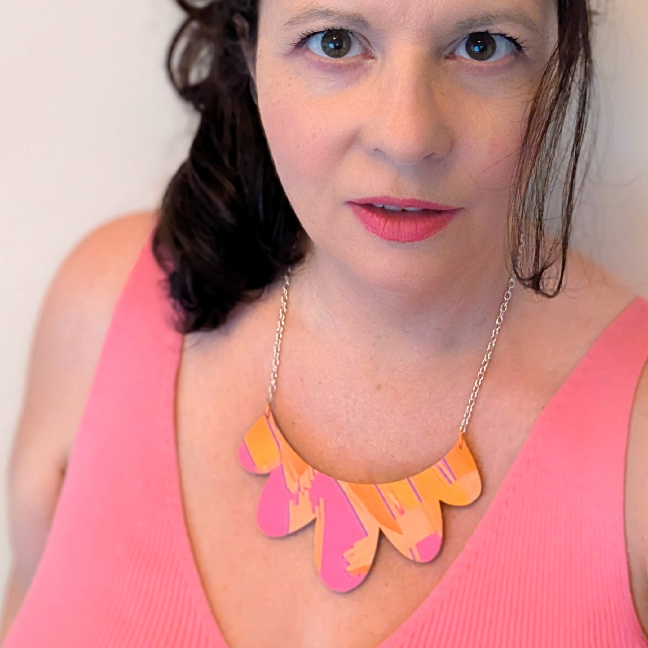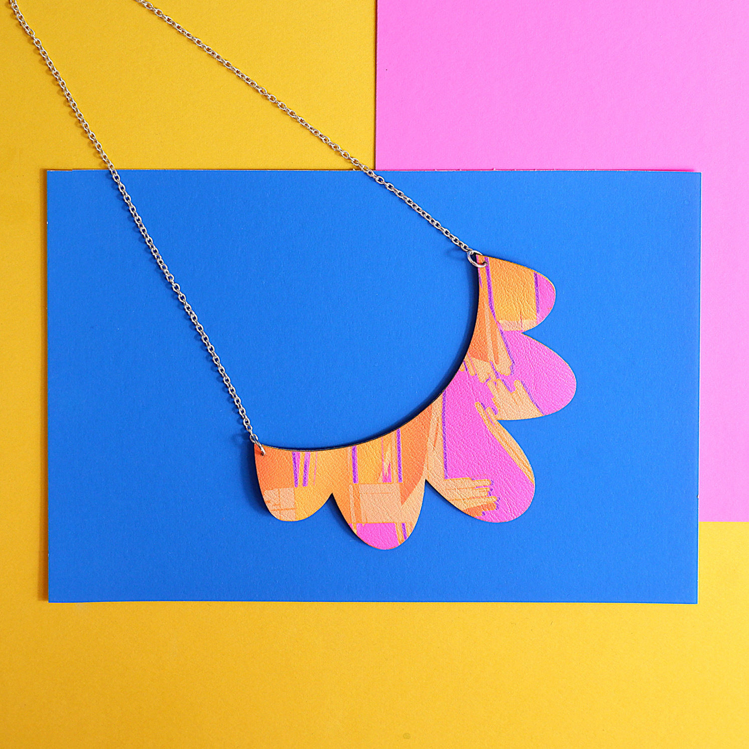 Step into a world of playful colour with this scalloped bib necklace, a bold and vibrant piece designed to make you stand out. Crafted from faux leather fabric and printed with my original graphic artwork, this necklace is a celebration of unique design and individuality.