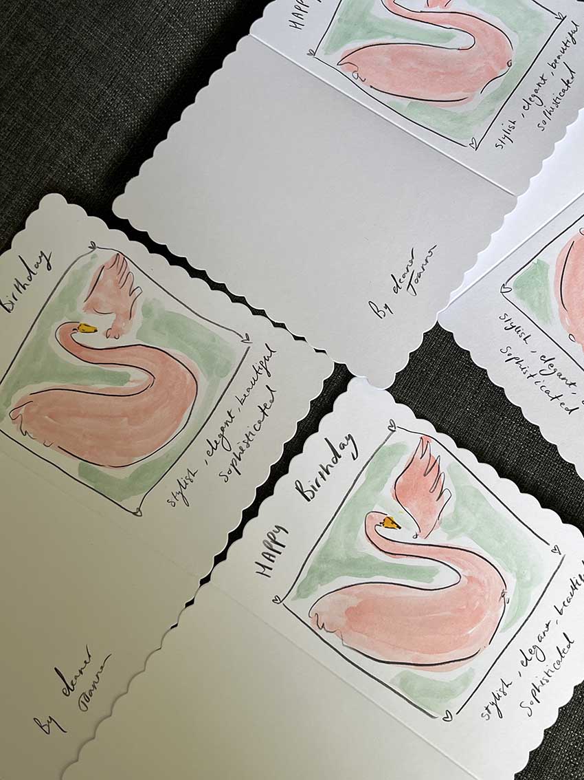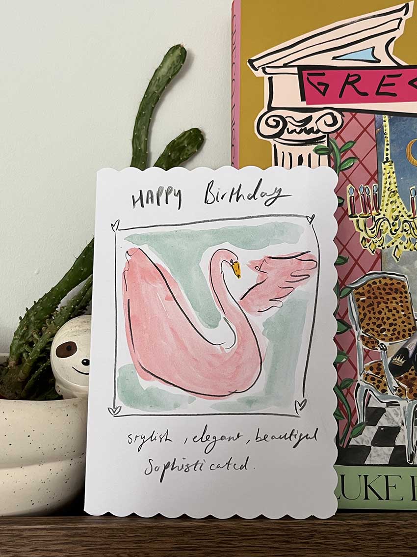 This charming 5×7 inch greeting card is a perfect way to convey stylish birthday wishes. Hand-painted in a soft watercolour style. The design features a graceful pink swan with wings gently outstretched, exuding sophistication and beauty. The swan, set against a wash of muted greens, is framed within a delicate border, adding to the overall refined aesthetic of the card.