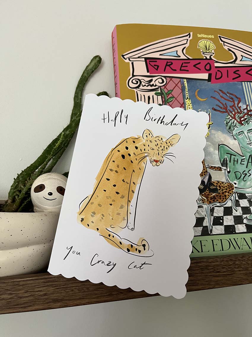 This delightful hand-painted birthday card is the perfect choice for the cat lover with a touch of wildness and humour. The card features a quirky illustrated cat, playfully drawn with a mischievous expression that’s sure to bring a smile to anyone’s face. Around the cat, the card reads, “Happy Birthday, you crazy cat,” adding a fun and whimsical vibe.