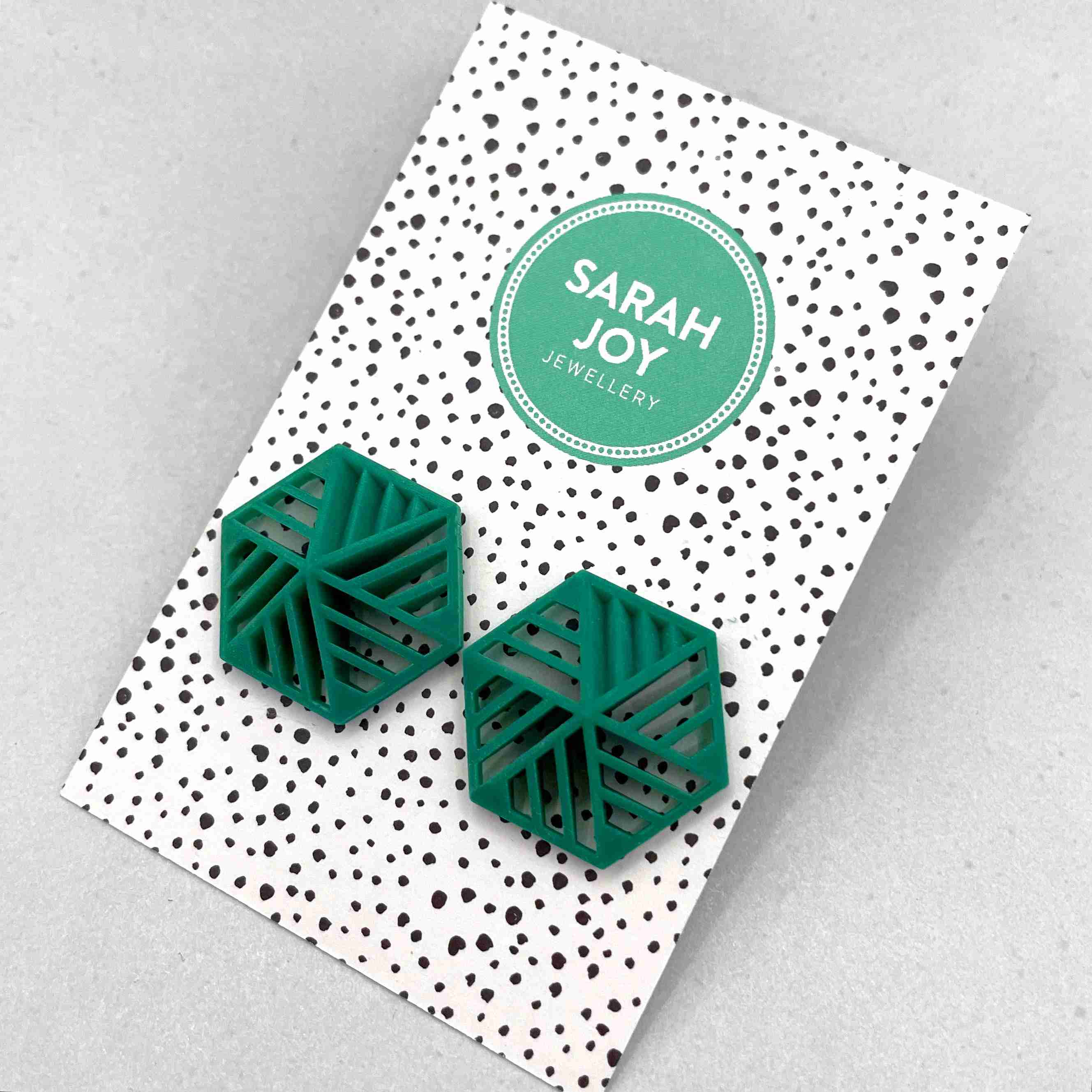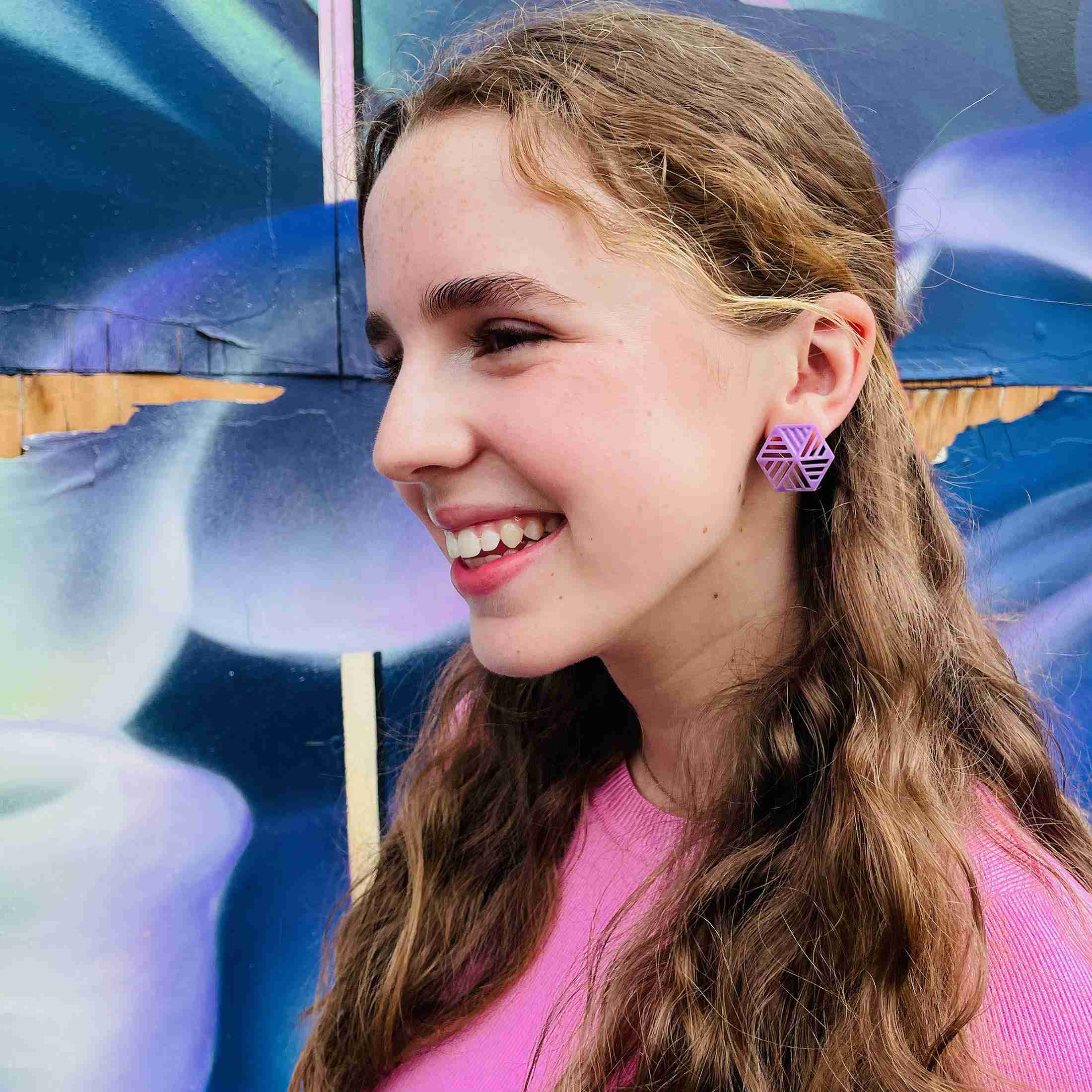 Striking and stylish hexagonal design 3D printed in lightweight resin; statement jewellery that’s easy on the ear.