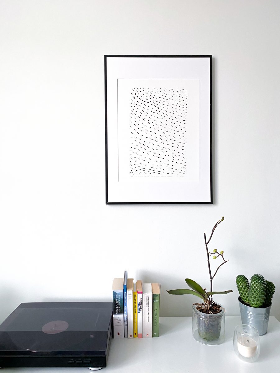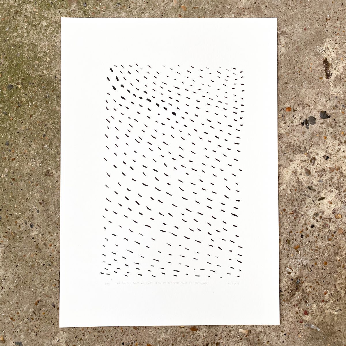 This print is called “Horizontal rain as last seen on the West coast of Scotland”. I drew this picture while I was staying in an artist residency near Helensburgh, Scotland. It was February and it was raining a lot – horizontally.