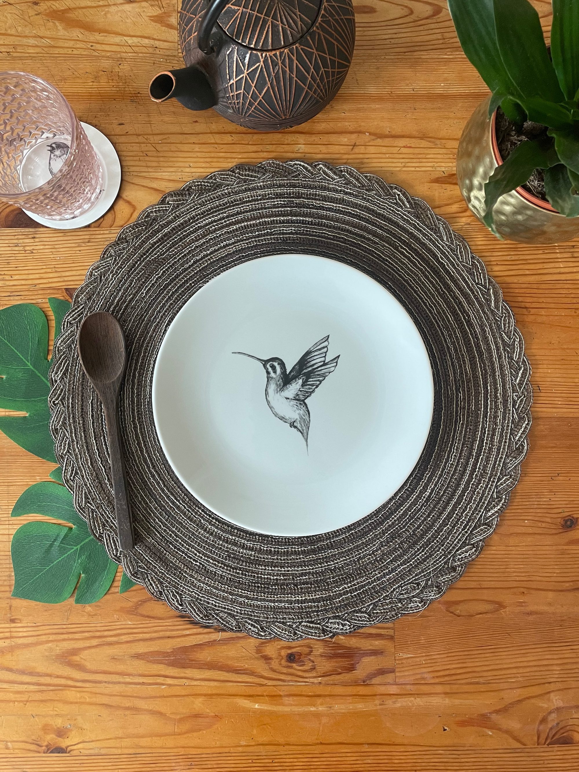 This stunning hummingbird plate shows the gorgeous Hook-billed Hermit Hummingbird in flight. Showcasing a unique hand-drawn illustration by me, it is perfect as part of a dining set or for display. This plate is part of the exclusive BirdLife Collection my collaboration with BirdLife International.