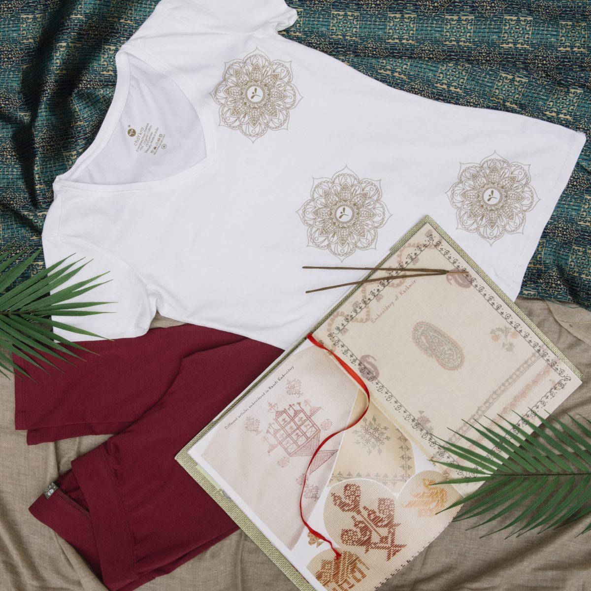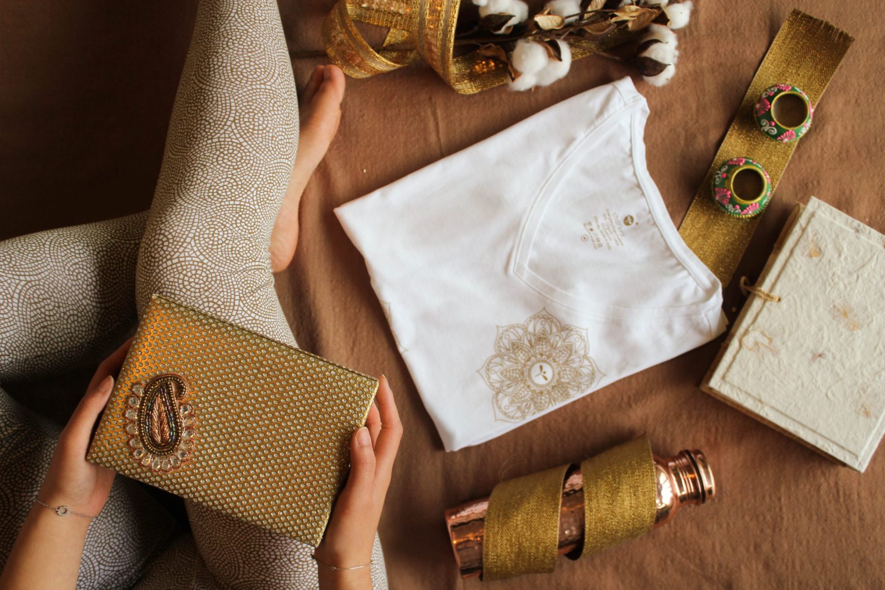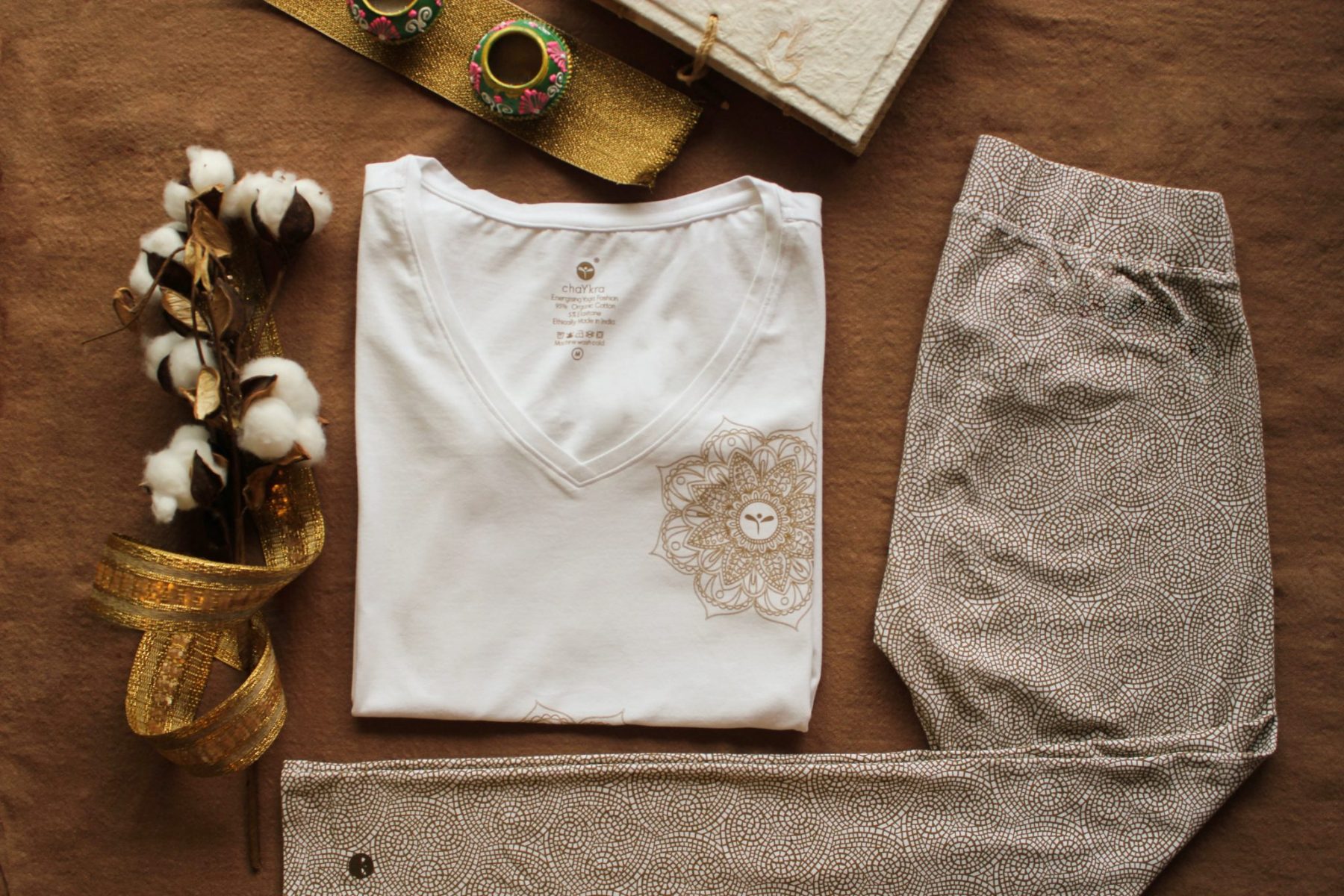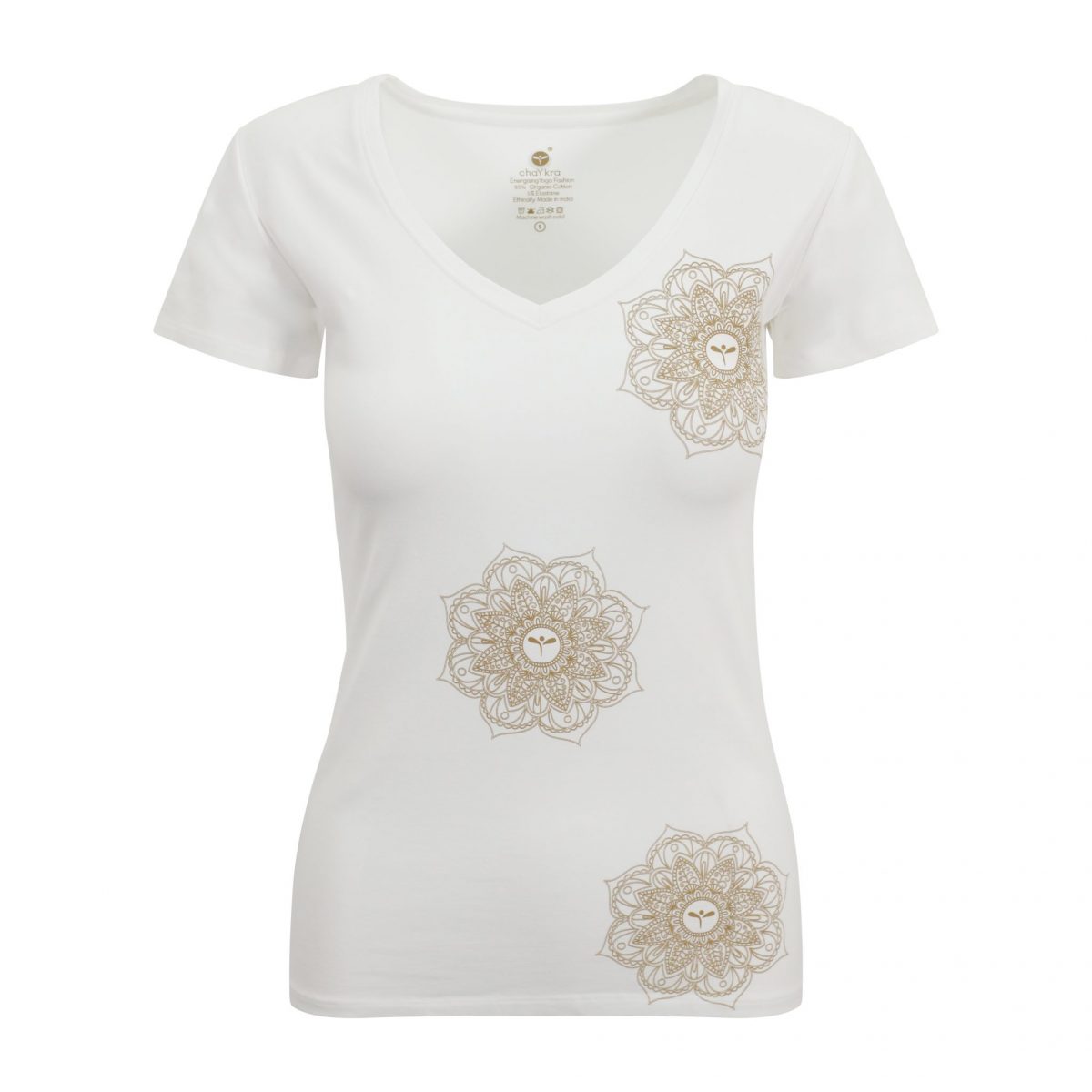 The gold flowers on this v-neck half sleeve yoga top have been crafted with classic Indian mandala designs in mind. This gold motif symbolises unity, representative of the relationship between mind and body during yoga practice. With a beautiful design and organic stretch cotton for maximum comfort, this top will be a staple in your yoga wardrobe!